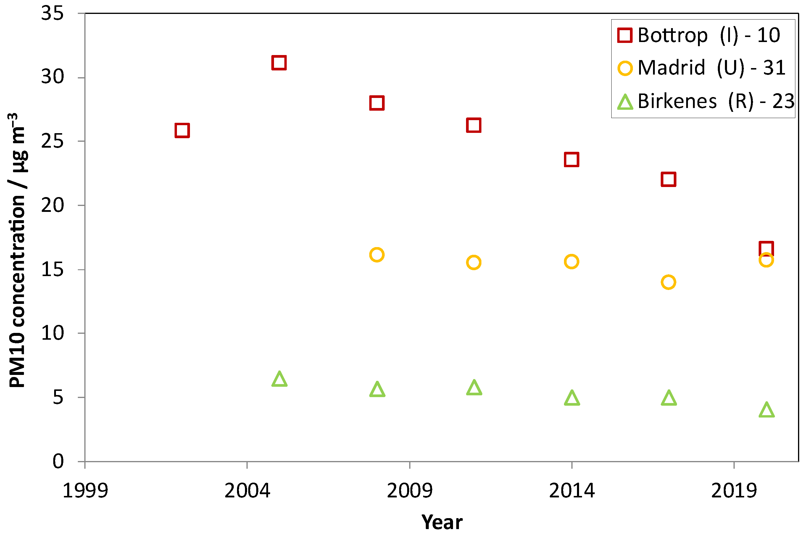 Figure 6 shows that PM10 concentrations in Birkenes (rural) and Madrid (urban) do not exhibit significant changes since the beginning of the monitoring campaign. PM10 concentrations in Bottrop (industrial) have approximately halved over the monitoring period. For HNO