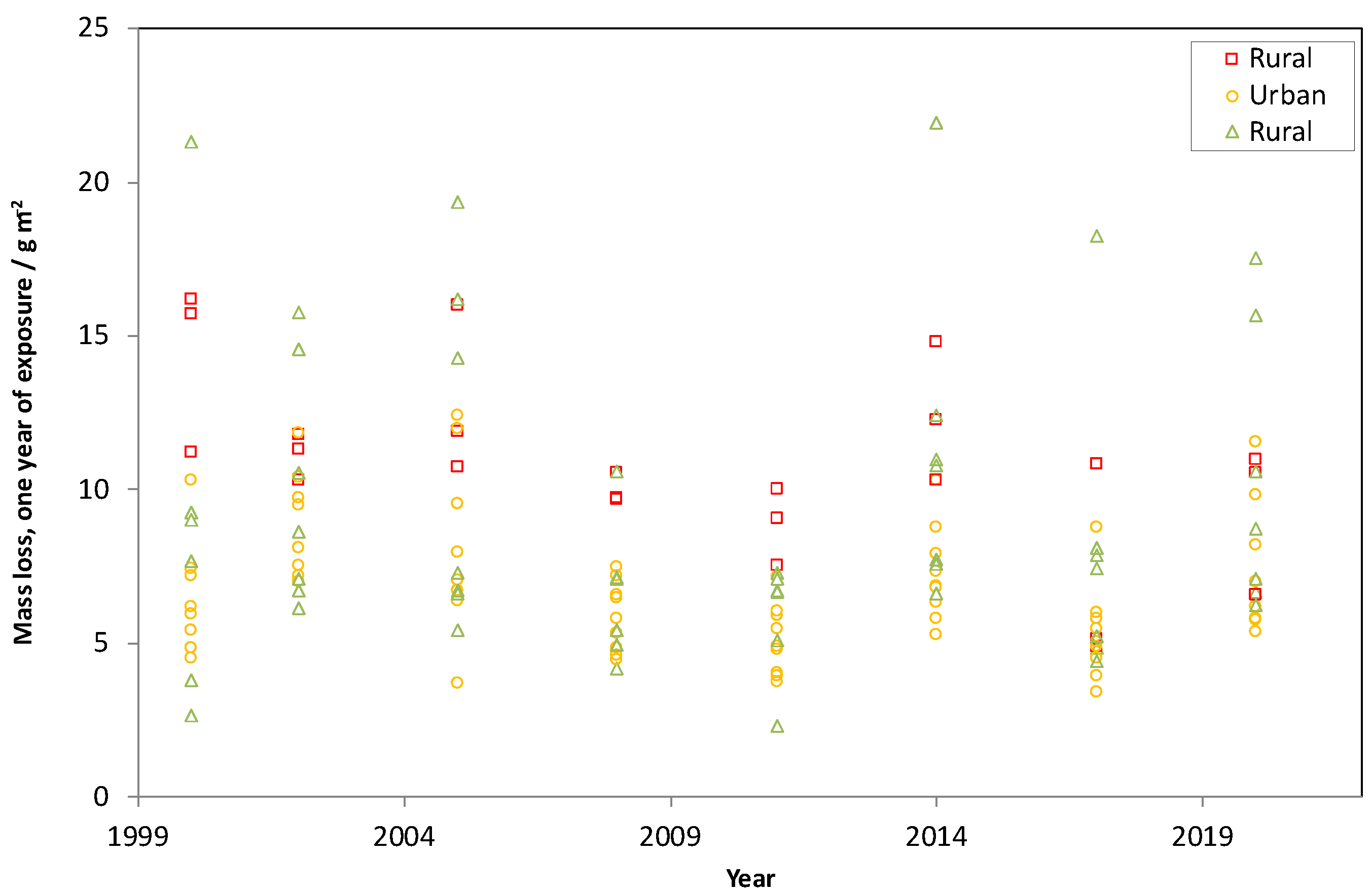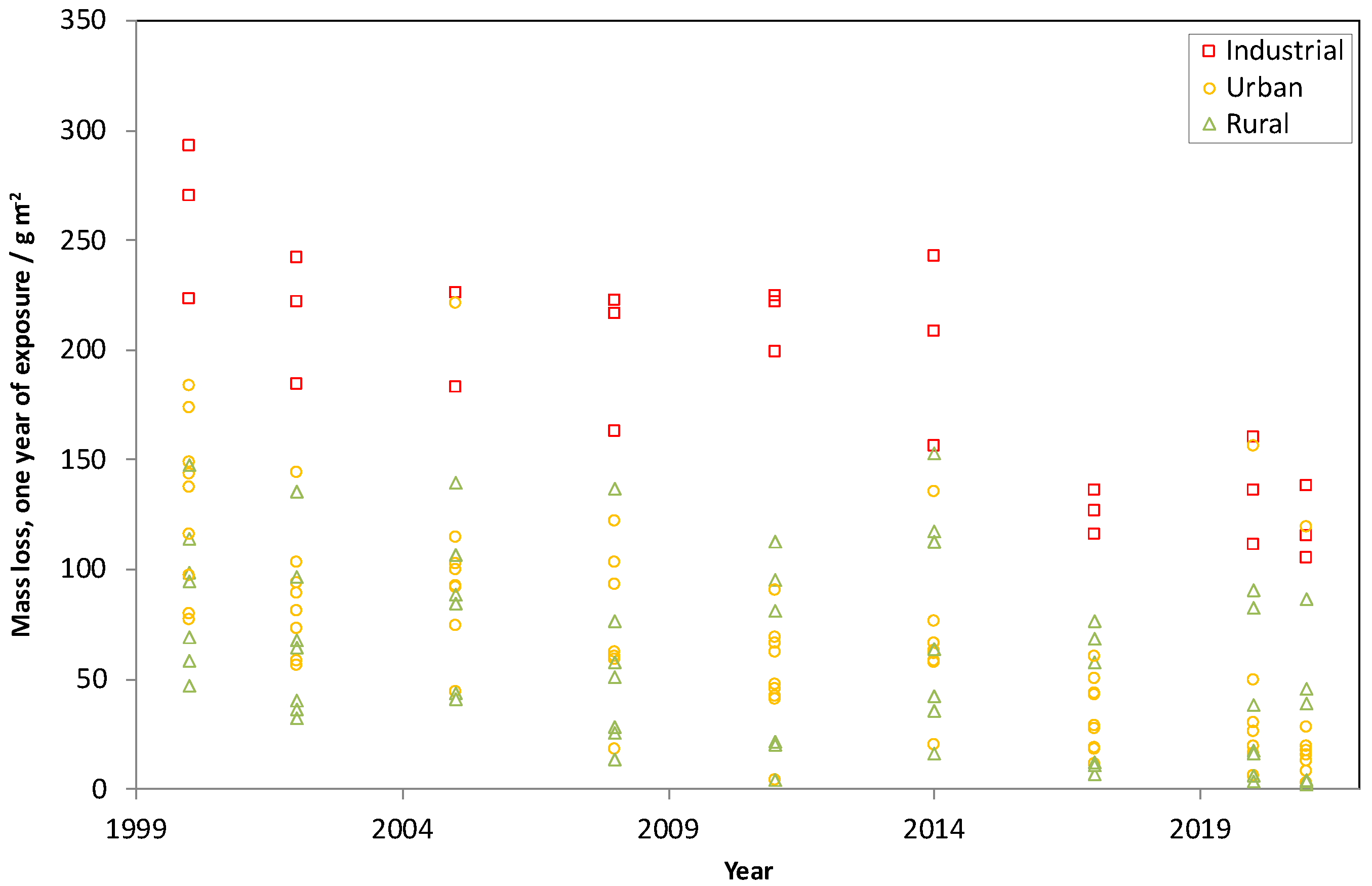 Figure 12 shows the yearly average mass loss of zinc (blasted panels) from the year 2000 in industrial, urban, and rural sites in one-year exposures. The corrosion trends for zinc exhibit a modest overall decline with no clear downward trajectory of carbon steel, with fluctuations spanning all over the century. Despite these fluctuations, the overall level of zinc corrosion is relatively low, on average below 15 g m