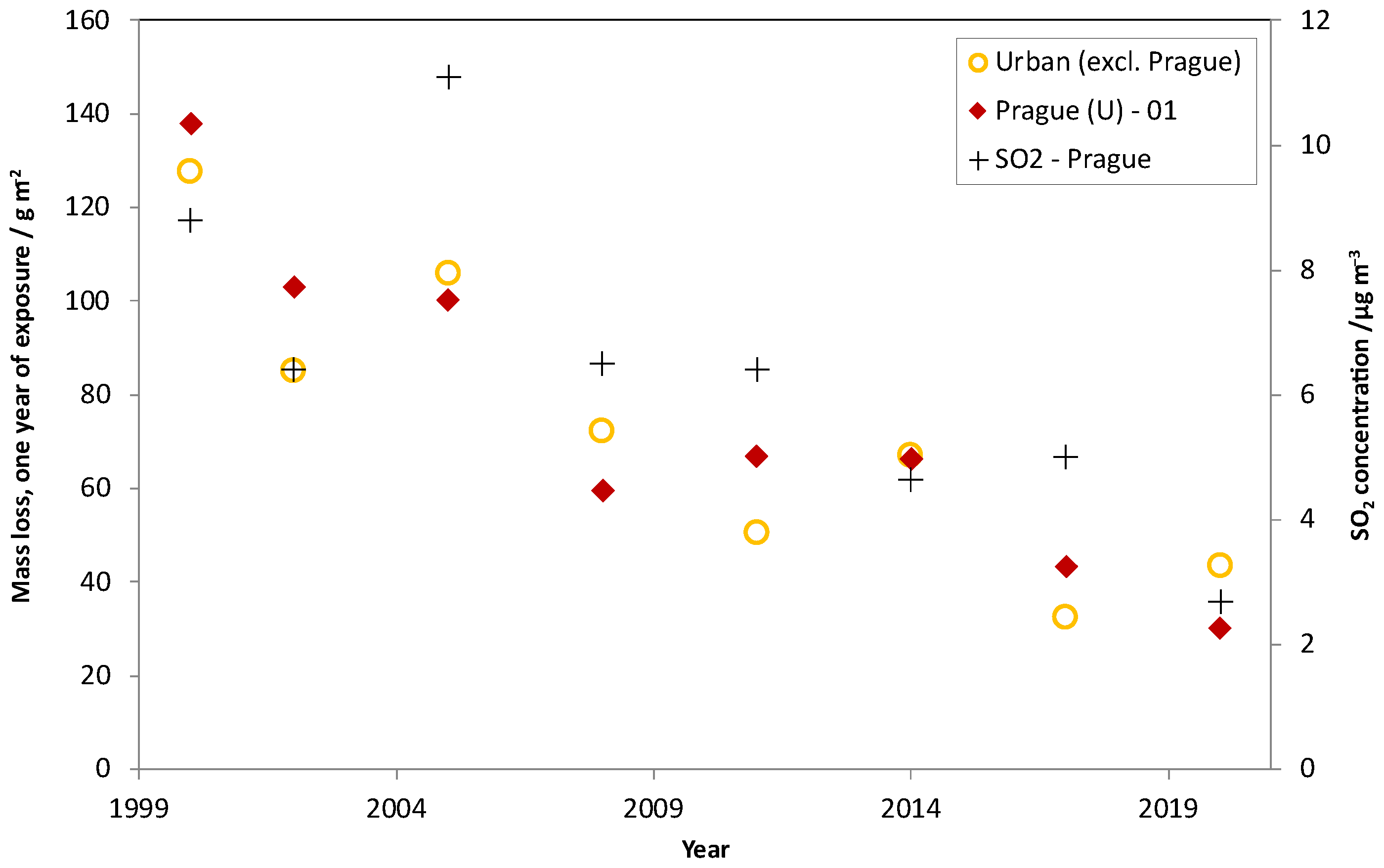 2 concentrations in Prague recorded since the year 2000. The corrosion levels in Prague follow the urban site trend over the years, and the downward trend observed in SO