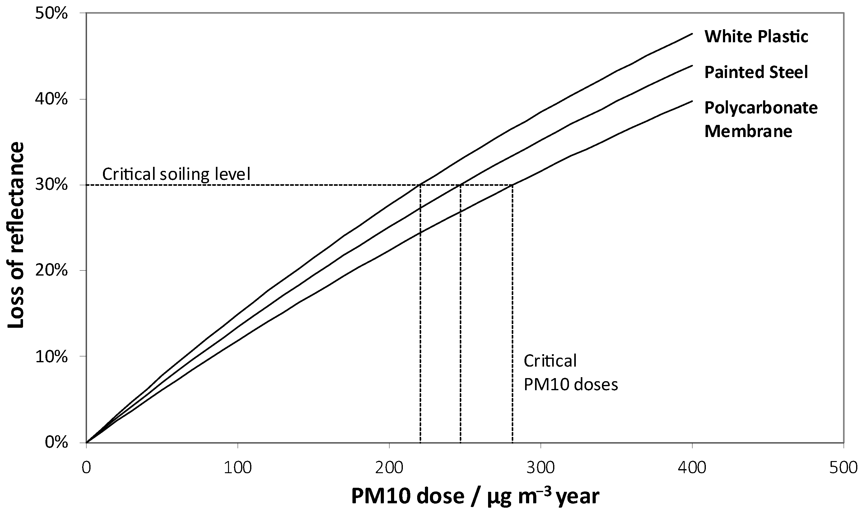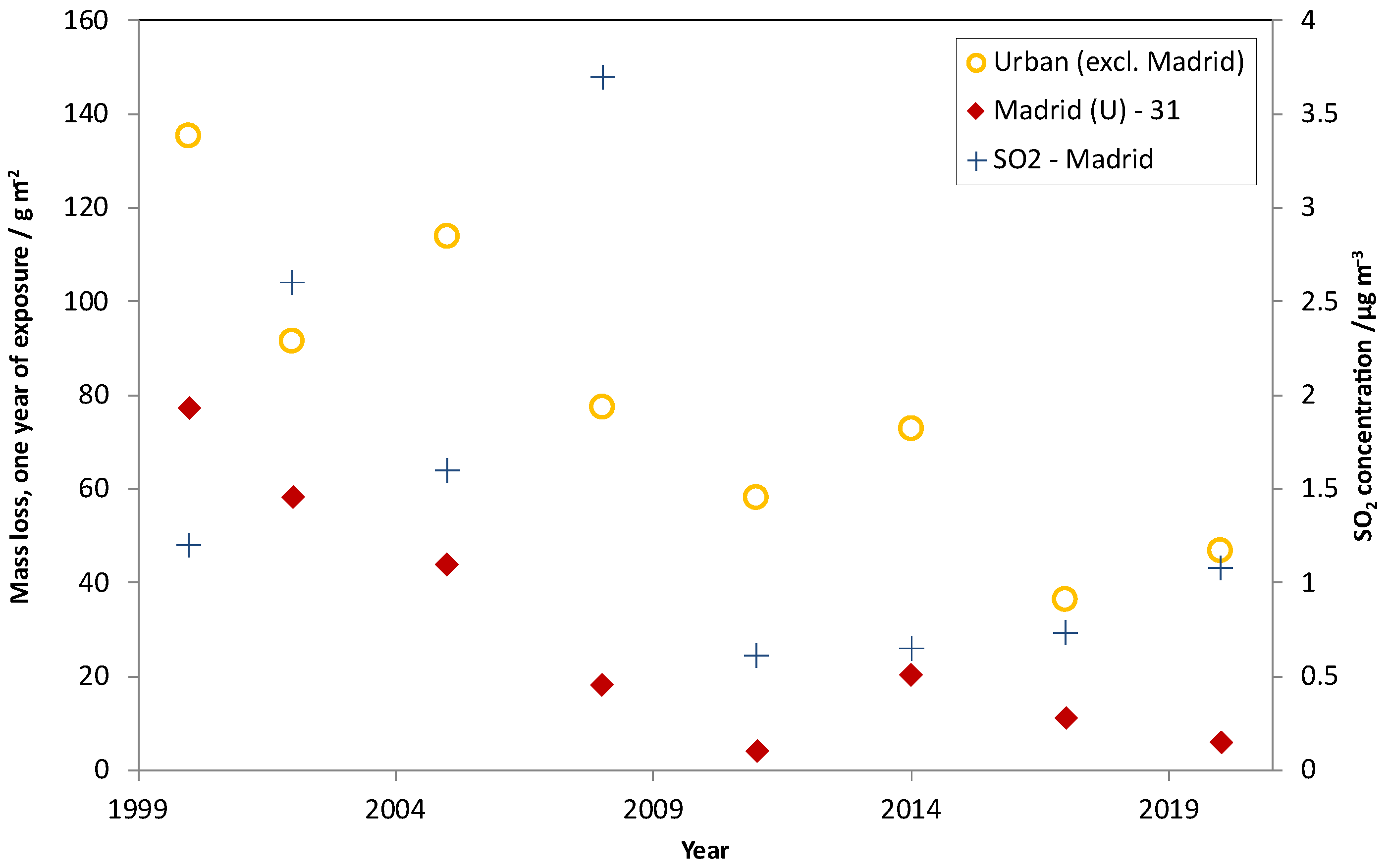 Section 3) but the decrease in corrosion directly related to decrease in nitrogen pollution is now less evident. Instead, particulate matter has the greatest attention and, while it contributes to corrosion of materials, it has a larger impact on soiling of materials, an effect that has not decreased at all since the first “soiling material” was introduced in 2005 (