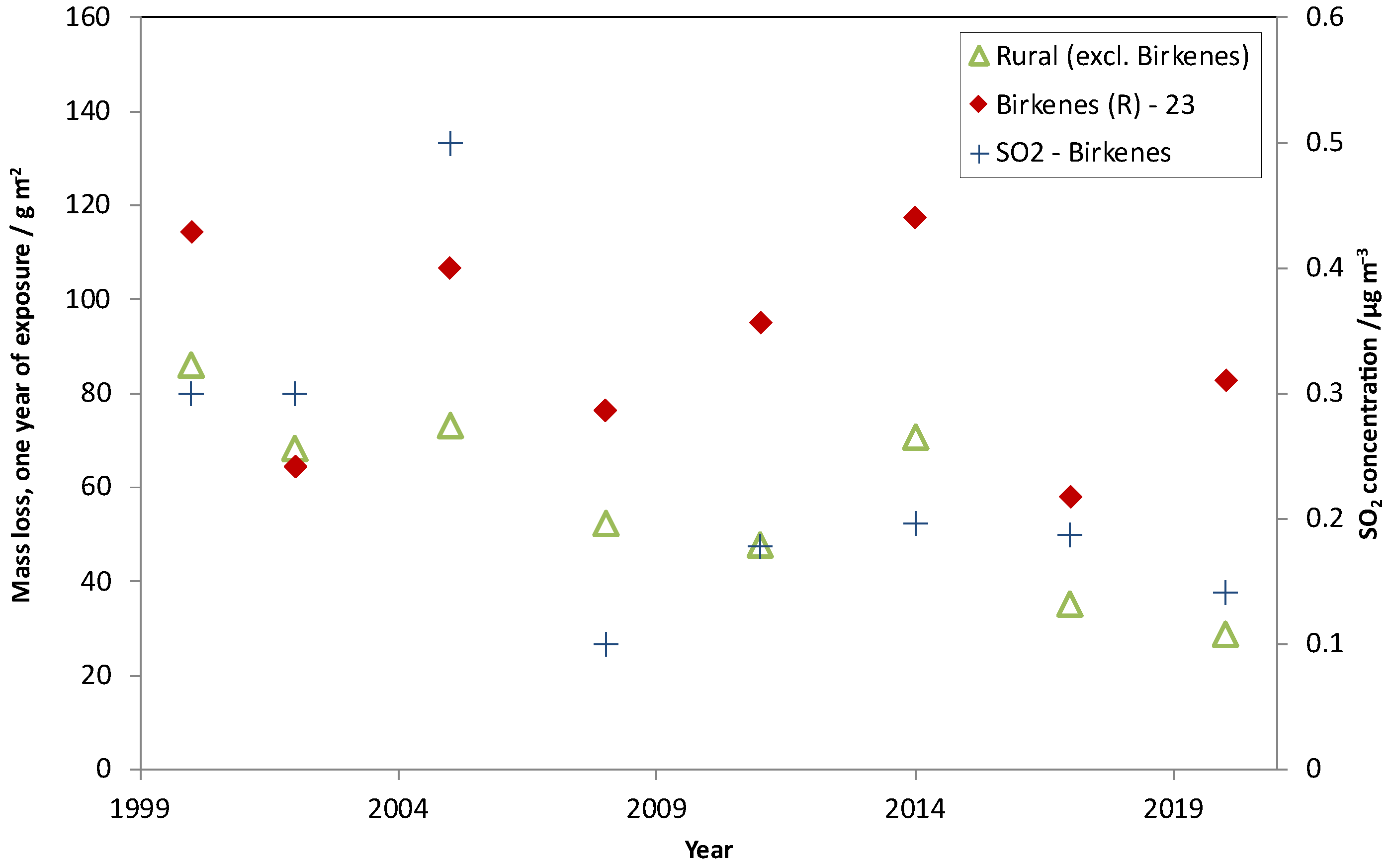 2 alone cannot fully account for the corrosion behaviour. For example, a particularly dry year could result in low corrosion levels, despite relatively high SO