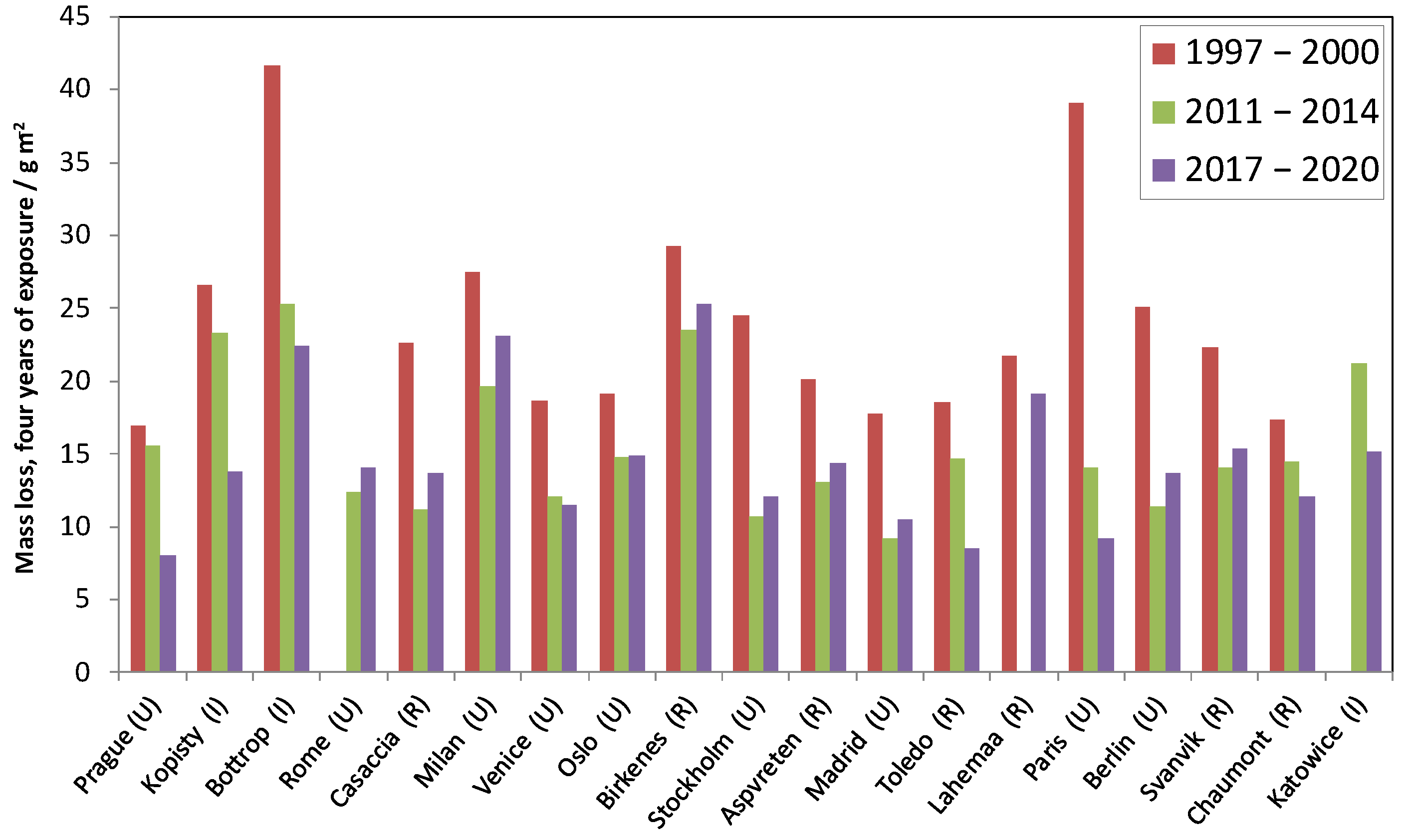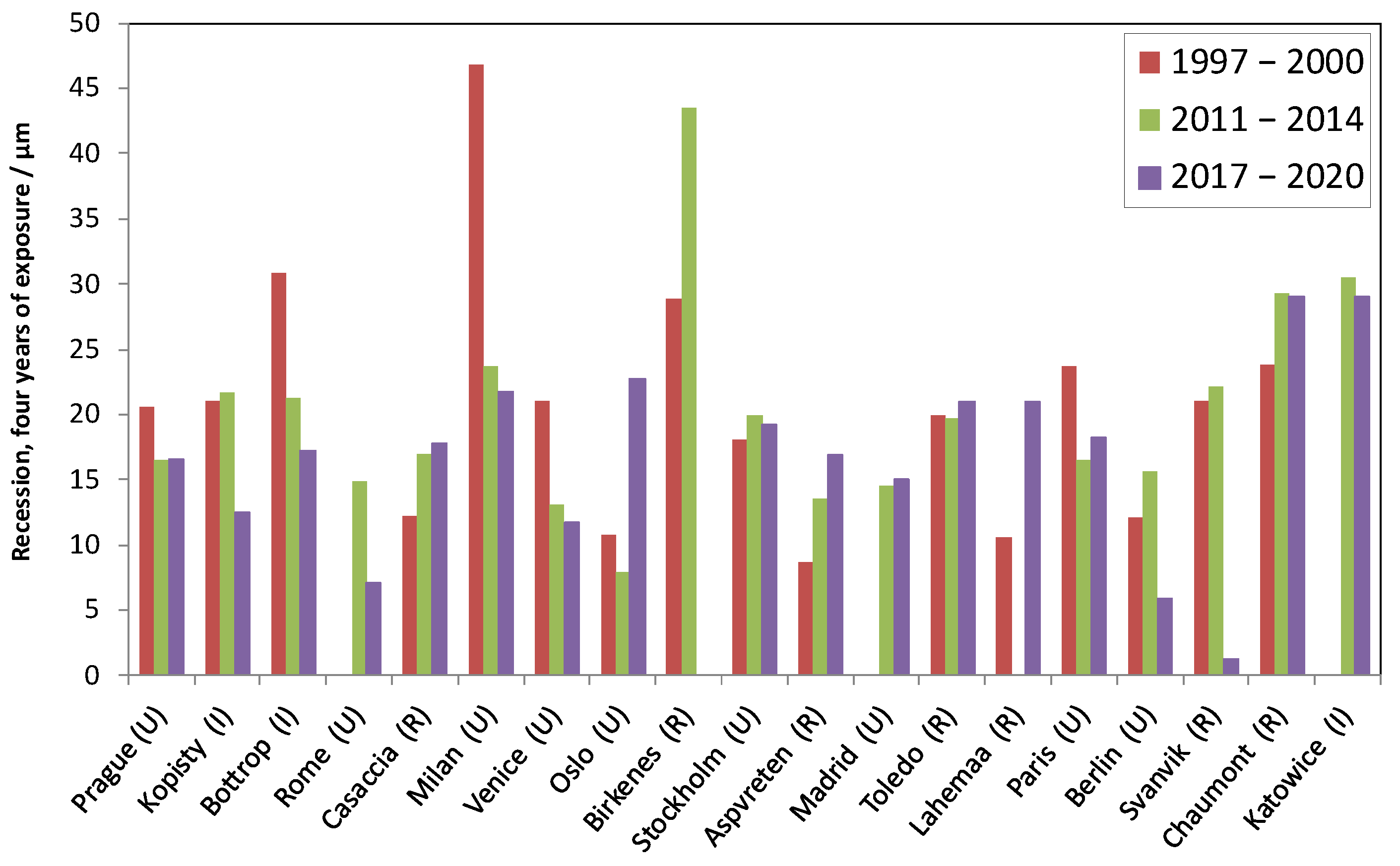 17], there was also a decreasing trend in corrosion for zinc when comparing the periods 1997–2000 and 2011–2014. When comparing corrosion of zinc for the periods 2011–2014 and 2017–2020, no obvious decreasing trend is observed. Four-year data is obviously more sensitive than one-year data for detecting trends in corrosion. Even so, for limestone there is no decreasing trend in surface recession after the turn of the century when comparing the four-year exposure periods 1997–2000, 2011–2014, and 2017–2020.