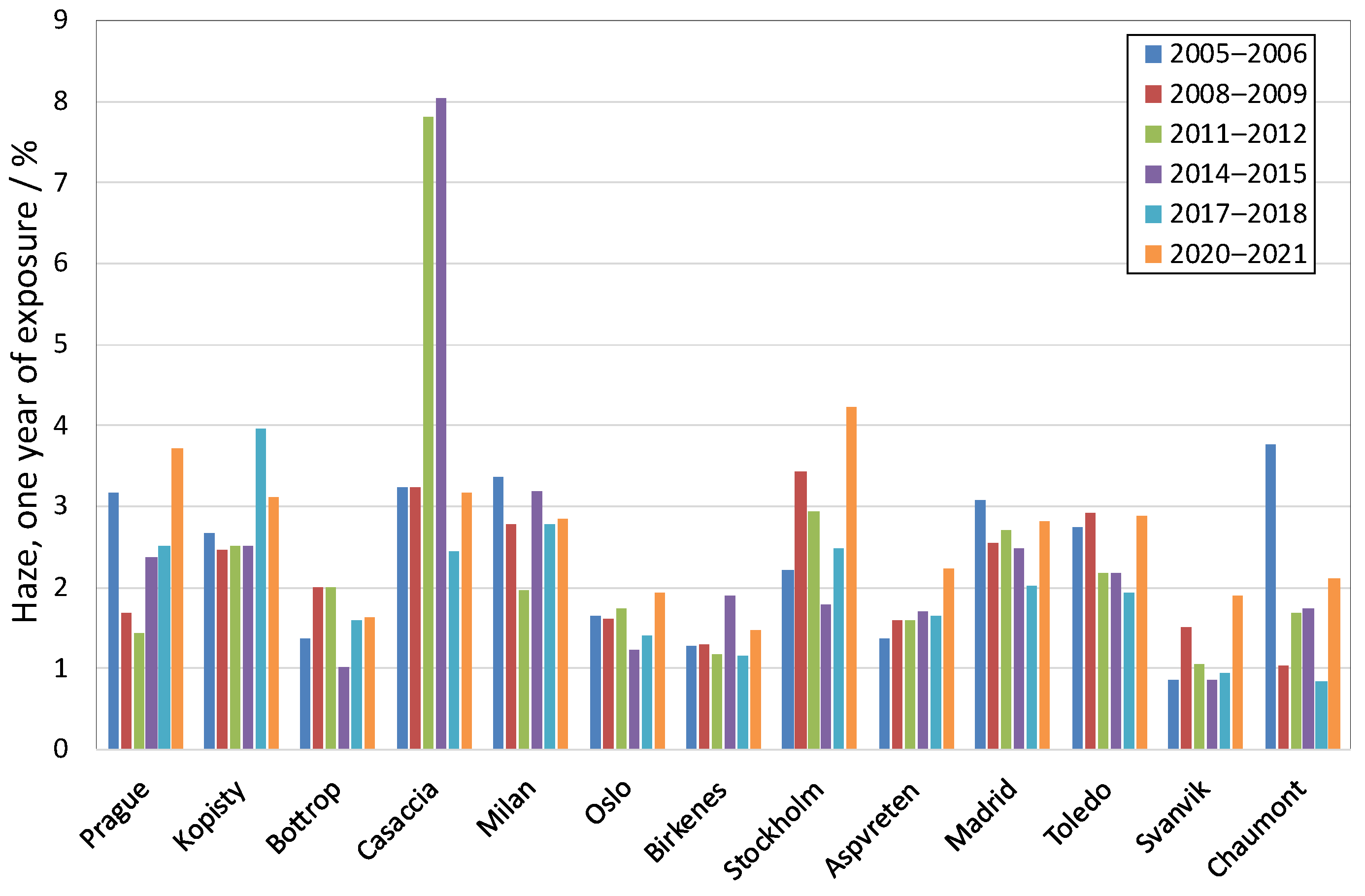1]). However, ozone levels show no decreasing trend and new exposures of polymeric materials are possible if a suitable material and subcentre can be identified. Otherwise, the pollutant highest on the agenda is particulate matter, which can affect both corrosion and soiling of materials. This will be the focus of ICP Materials for the coming years together with continued assessment of sulphur pollutants and to what extent they remain important for corrosion.