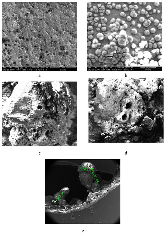 Figure 1 shows that corrosion of the zinc coating develops unevenly and has an ulcerative character with the formation of anode and cathode areas. Similarly to uncoated steel pipes, tubercles on the pipe surface consist mostly of oxides and zinc carbonate. This makes corrosion running intensive, with hydrogen depolarization and the release of hydrogen (see round holes on the surface of the scale, Figure 1c,d).