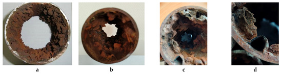 Figure 8 shows typical photographs of cross-cutting damage to the pipe wall in the form of fistulas formed due to corrosion of galvanized steel [34] and non-galvanized steel pipes. The tubercles with intense internal corrosion were directly above the fistulas.