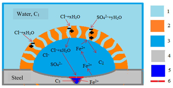 It should be assumed that pitting corrosion in stainless and carbon steels may work via a similar mechanism [42,43,44,45]. The role of the coating over the pitting (Figure 4, pos. 6) demands further study; however, it acts also as a selective barrier that increases the transfer of chlorides.