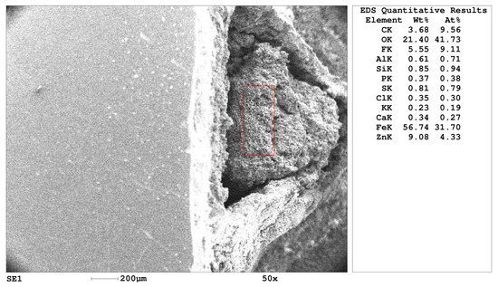 Figure 5 clearly shows a dense layer and a loose core, whose main components are iron, zinc, and oxygen (cations); sulfates and chlorides act as anions. The content of sulfates exceeds the content of chlorides, which indicates the different nature of the permeability of the dense layer to anions depending on the sample under study (see Table 2). The dense layer is firmly bound to the pipe wall, while the core has a loose structure and shrinks when drying. Figure 5 also shows that, despite to the dimensions of the tubercle, the pipe wall has minor damage. At the same time, there are no signs of the transition to more destructive corrosion with the formation of fistulas.