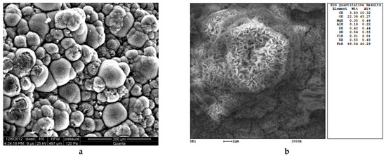 Analysis of a large number of tubercle samples removed from pipes (similarly to Figure 5) revealed that a salt solution at the core–metal boundary, after drying, forms hemispherical crystalline elements (Figure 6). The scale crystallization from a saturated solution of iron salts occurred after the pipe was taken out of operation and exposed to atmospheric oxygen.