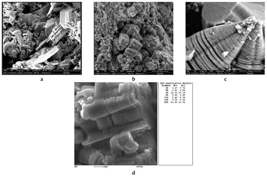 Figure 7. Microphotographs of crystalline replicas formed in the cavities of the pitting: (ad)—uncoated steel pipes; (c)—galvanized pipe from the HWSS.