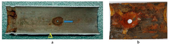Figure 8. (a) Through-wall damage in the lower part of the NPS3 galvanized steel pipe (with an outer diameter of 3.5 inches) in the dry pipe system [35]; (b) uncoated steel pipe (DN150) from the heating system.