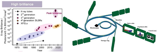 (Left) Increase in X-ray brilliance with new generation of synchrotrons [46]. (Right) Illustration of synchrotron ring and beamlines [47].