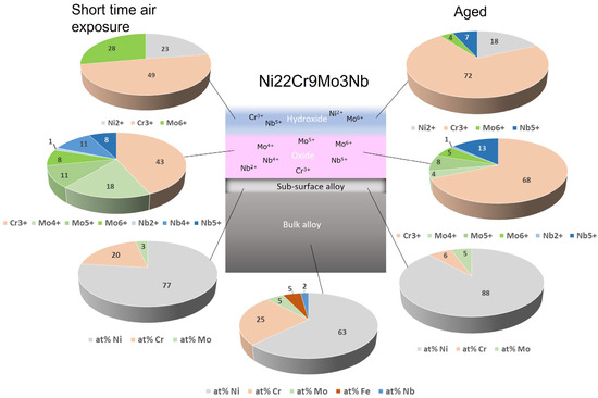 Pie diagrams showing relative compositions in at% (total contents normalized to 100%) of the passive film on Ni22Cr9Mo3Nb, following brief air exposure (left) and prolonged aging (right), derived from a layered model featuring a hydroxide layer atop an oxide layer, formed on the alloy possessing a sub-surface alloy layer with different composition from the bulk alloy [87].