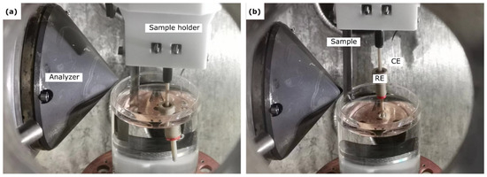 Photos showing the analyzer, EC cell, sample holder, and electrodes. (a) Sample submerged in electrolyte beaker for electrochemical treatment. (b) Sample retracted from the beaker to measure AP-XPS [91].