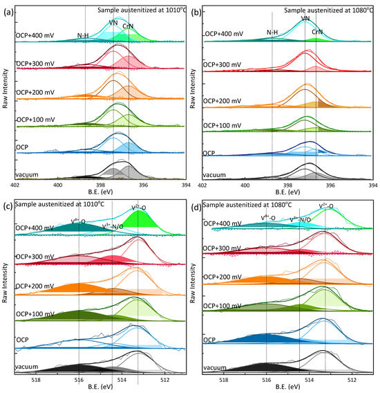 High resolution AP-XPS spectra of core levels of N and V for the 1010 °C (left column) and 1080 °C (right column) austenitized samples after exposure under different conditions. (a,b) N 1 s spectra showing Cr-N, V-N, and N-H components. (c,d) V 2p spectra showing V2+ and V4+ oxides and V3+ nitride/oxide [94].