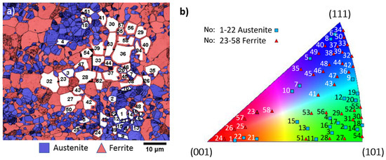 (a) EBSD phase image of the measured area with the austenite phase marked in blue and ferrite phase in red, and the grains selected for analysis are numbered and marked in white. Grains 1–22 are austenitic and 23–58 are ferritic. The crystallographic orientation of each grain is shown in the inverse polar figure in (b), with austenite grains marked as blue squares and ferrite grains as red triangles [103].