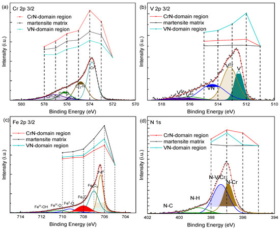 XPS spectra of the peak 2p3/2 for (a) Cr, (b) V, and (c) Fe and 1s for (d) N obtained utilizing HAXPEEM from the central area of the Cr nitride and V nitride domains (0.5 × 0.5 μm2). These spectra are compared with the high-resolution XPS spectra from the HAXPES for the whole ROI to assist the peak identification [104].