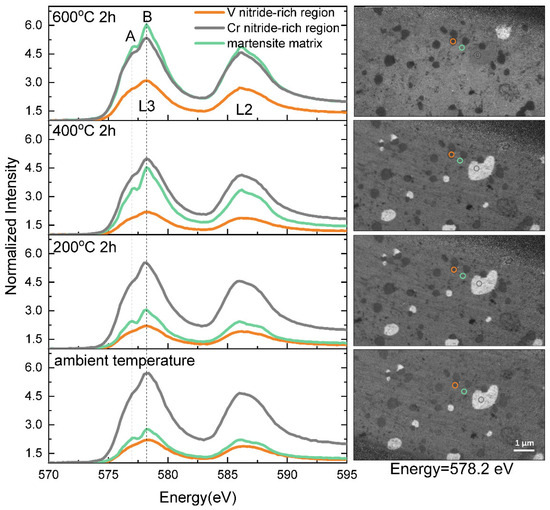 Micro-XAS images at a photon energy of 578.2 eV and corresponding Cr L-edge XANES spectra extracted from the martensite matrix (green), V nitride-rich region (orange), and Cr nitride-rich region (gray), respectively, of the V- and N-containing martensite stainless steels at ambient temperatures of 200, 400, and 600 °C. The colored circles on the images indicate the marked regions from which the spectra were extracted [104].