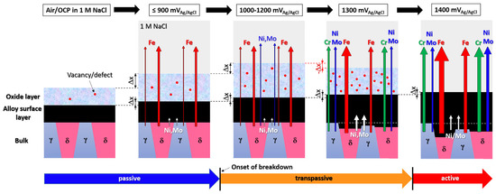 Schematic summary of the key findings. Increasing arrow width indicates enhanced dissolution with increasing potential. Selective dissolution of the ferrite (δ) is illustrated as a recession in the vertical direction of the δ phase in comparison with the austenite (γ). The arrow thickness indicates the extent of dissolution [105].