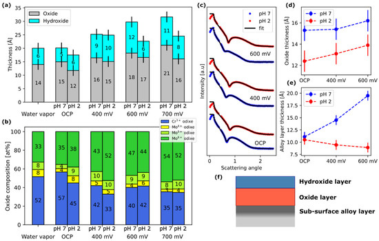 (a) Oxide and hydroxide thickness in 0.1 M NaCl at pH 7 and pH 2, calculated from the AP-XPS data. (b) Oxide composition extracted from the AP-XPS data. (c) Fitted in situ XRR data obtained at OCP and under polarization at 400 and 600 mV vs. Ag/AgCl in 1 M NaCl at pH 7 and pH 2. (d) Oxide thickness extracted from the XRR data. (e) Alloy layer thickness from the XRR data. (f) Schematic model of the surface region [108].