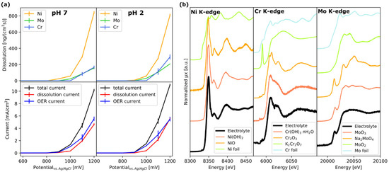 (a) (Top) Metal dissolution rate calculated from in situ XRF data. (Bottom) Dissolution current density and OER current density, compared to the total current density. (b) Chemical state determination of the dissolved species using in situ XANES (only for pH 7). Spectra of references are also shown for comparison [108].