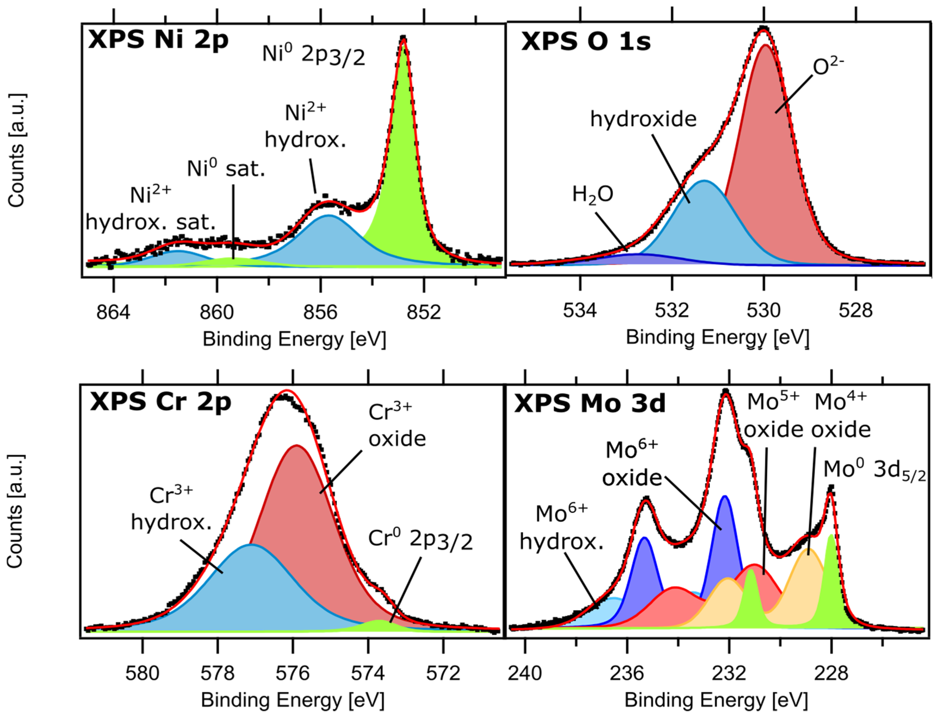 Using the EA01 end station at the FlexPES beamline at MAX IV, Sweden, we performed in situ XPS experiments to study the dynamics of early-state oxide formation on Alloy 59 at room temperature and up to 400 °C [86]. The sample was sputtered with Ar+ ions to remove the native oxide from the surface, and then an XPS survey spectrum was measured to check for and exclude the presence of any contamination. During the in situ oxidation experiment, O2 was dosed from a leakage valve, and a pressure of 1 × 10−8 mbar was maintained in the chamber. While dosing O2, the Cr 2p, Ni 2p, O 1s, and Mo 3d core levels were measured repeatedly in sequence. The high-quality XPS data allowed quantitative deconvolution fitting, showing the formation and growth of Cr3+, Mo4+, and Mo6+ oxides, reaching a self-limiting oxide thickness of 6–8 Å, which did not depend on the temperature below 400 °C. The in situ XPS measurements confirmed that Ni does not contribute significantly to the oxide film and showed sublimation of Mo6+ oxide at 400 °C [86].