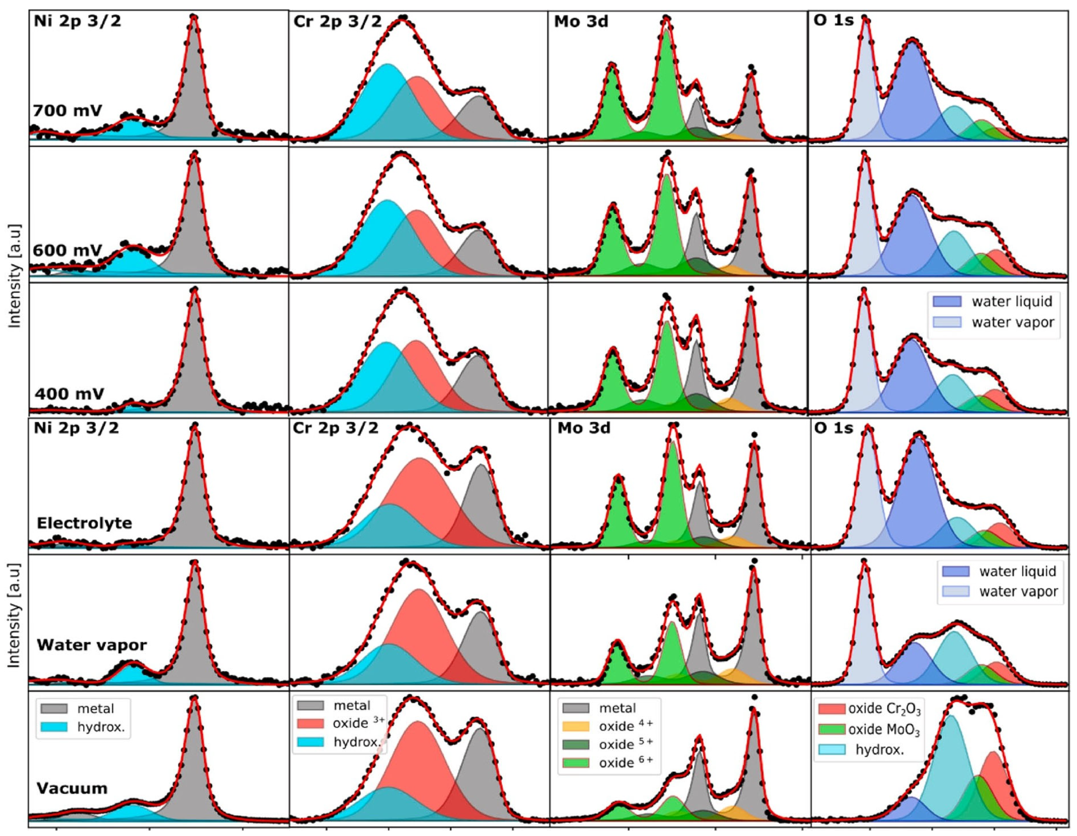 Figure 5. AP-XPS spectra of Ni 2p, Cr 2p, Mo 3d, and O 1s core levels from Alloy 59, measured in vacuum and water vapor, after immersion in the electrolyte (0.1 M NaCl), and after polarization at 400 mV, 600 mV, and 700 mV/Ag/gCl [91].