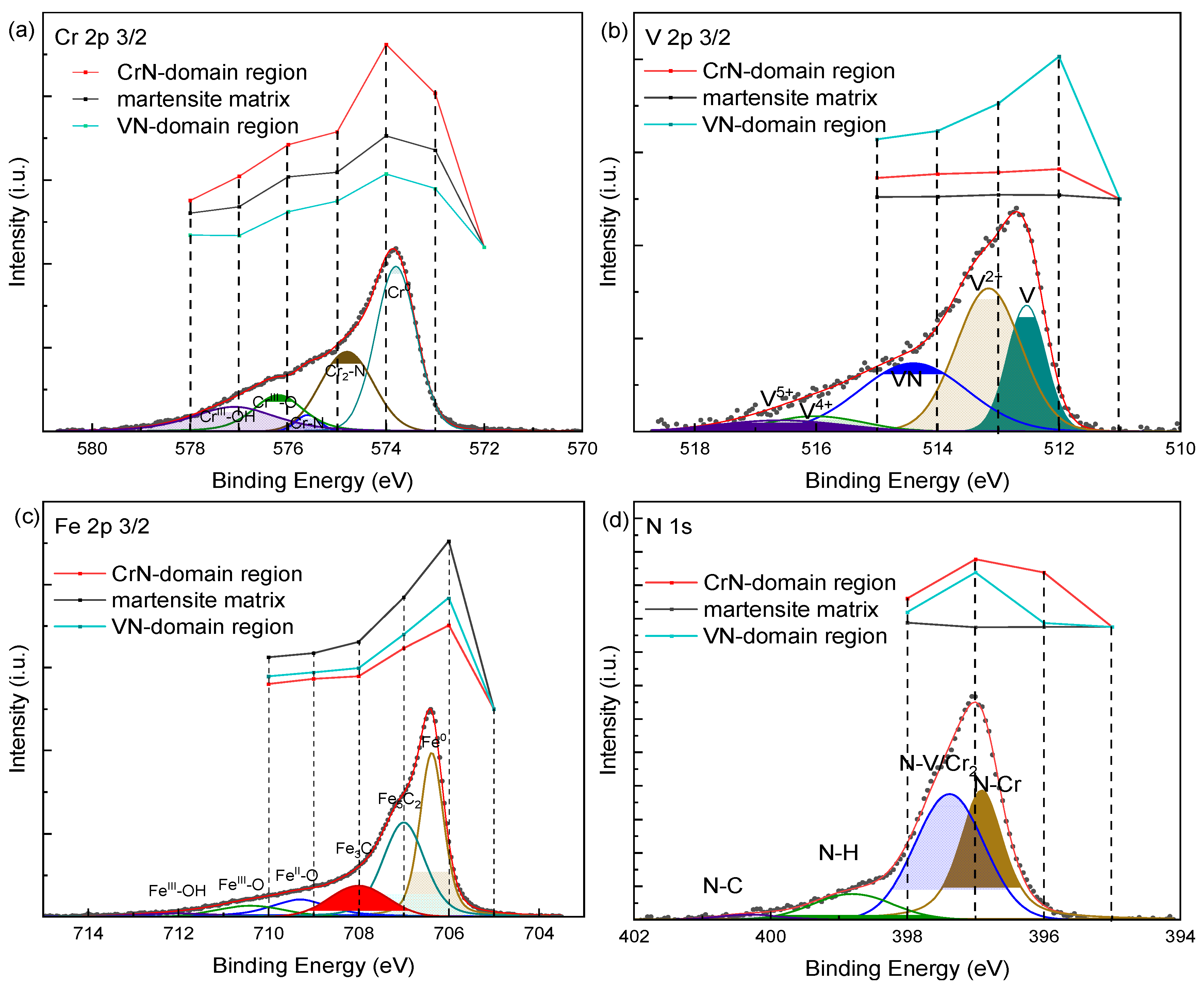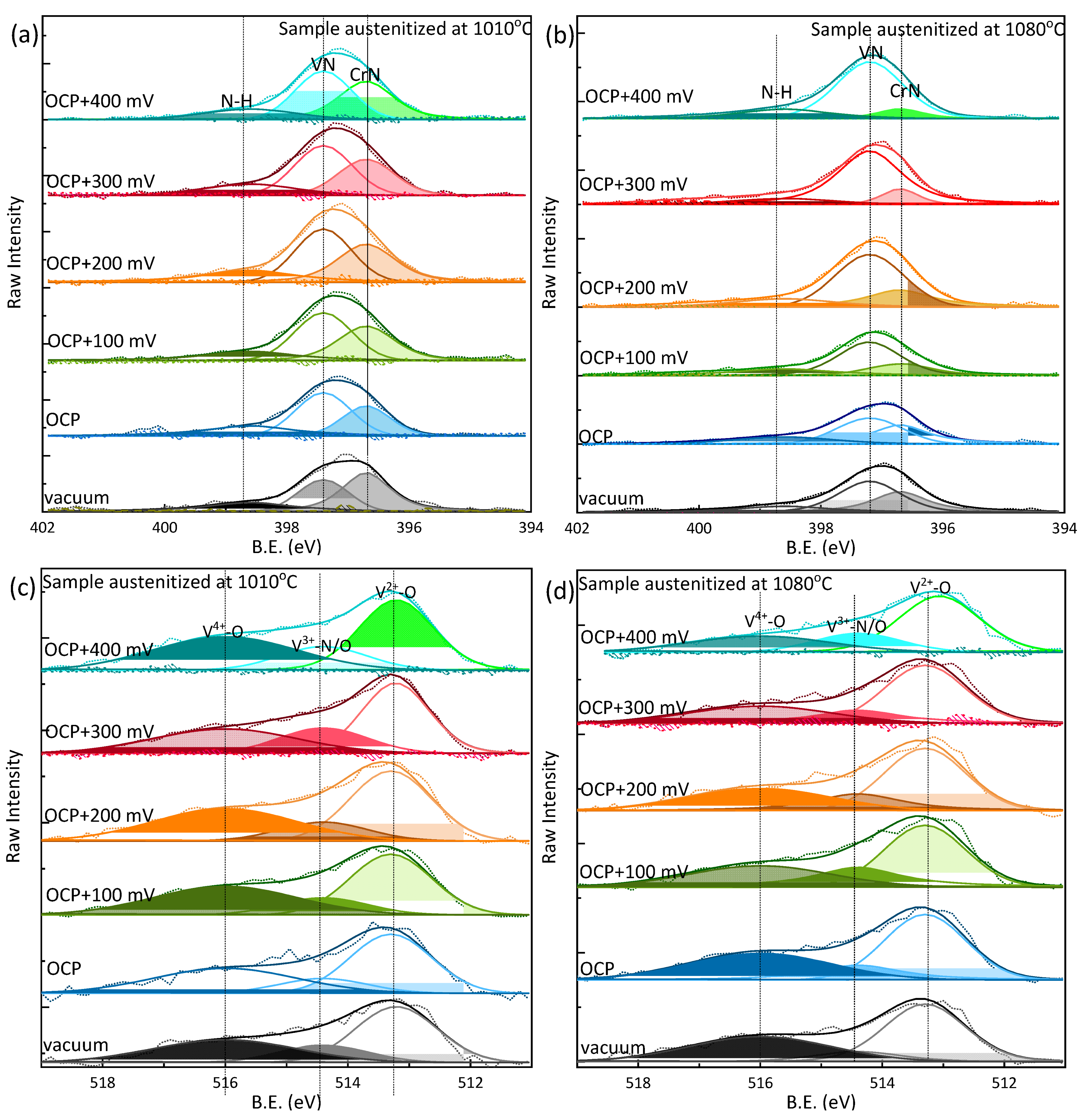 Figure 6. High resolution AP-XPS spectra of core levels of N and V for the 1010 °C (left column) and 1080 °C (right column) austenitized samples after exposure under different conditions. (a,b) N 1 s spectra showing Cr-N, V-N, and N-H components. (c,d) V 2p spectra showing V2+ and V4+ oxides and V3+ nitride/oxide [94].