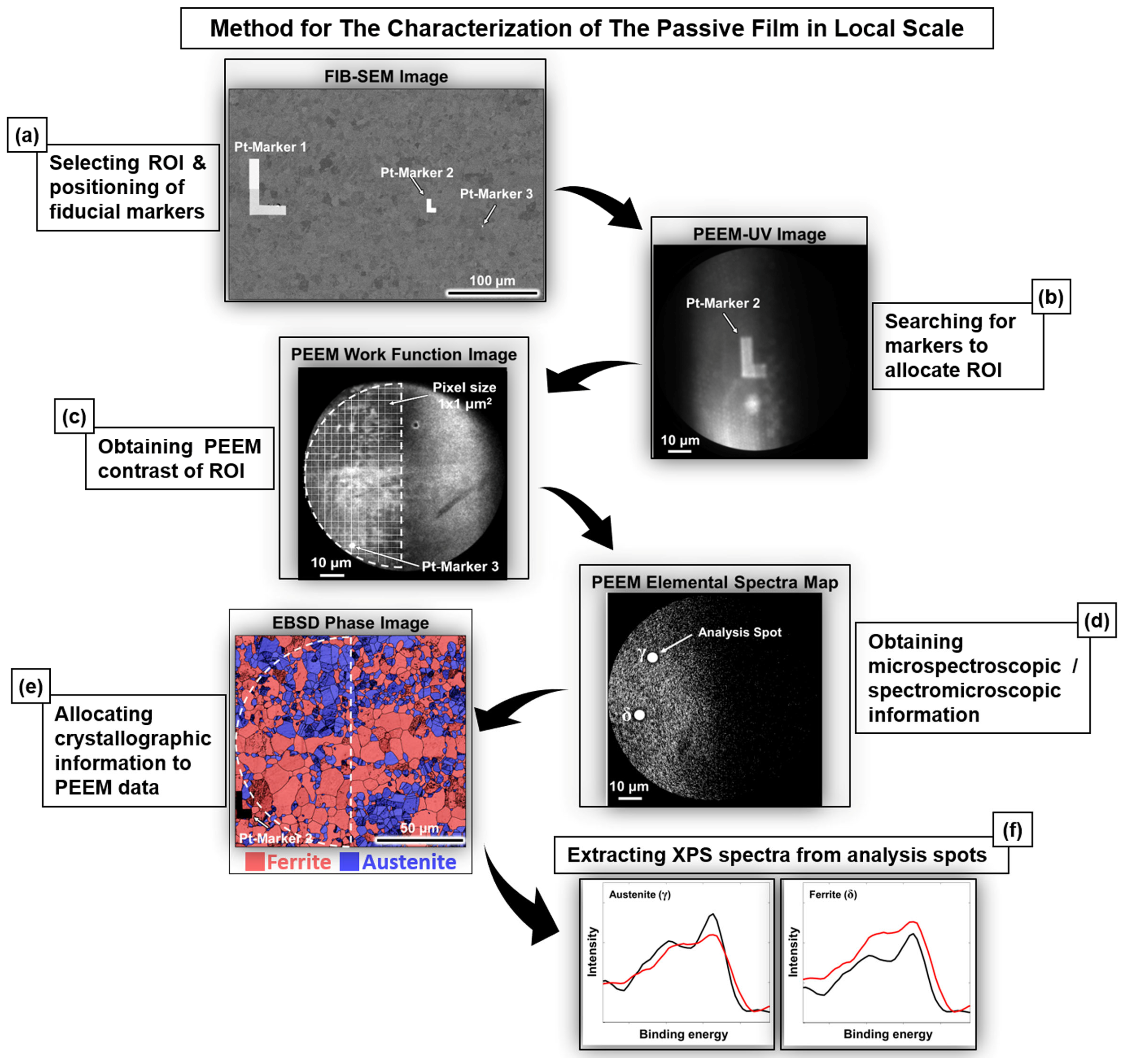 By utilizing the P22 beamline at PETRA III at DESY, we have performed synchrotron HAXPEEM measurements of a 25Cr-7Ni super duplex stainless steel to analyze the native air-formed oxide and anodic passive film on the austenite and ferrite phases [101]. Prior to the measurement, by using the facilities at DESY NanoLab [102] and an established protocol, Pt fiducial makers were deposited on the surface of the samples in a dual-beam focused ion beam FIB-SEM instrument to mark the region of interest (ROI) of ca. 200 μm × 200 μm, representative of the whole microstructure. This enables easy finding of the ROI utilizing UV imaging for subsequent HAXPEEM measurements before and after ex situ electrochemical polarization, and later re-access the ROI for SEM/EBSD characterization to gain complementary microstructure information. This enables us to establish a one-to-one correlation between the analyzed site and the microstructure feature. The procedures for the HAXPEEM measurement are schematically shown in Figure 7.