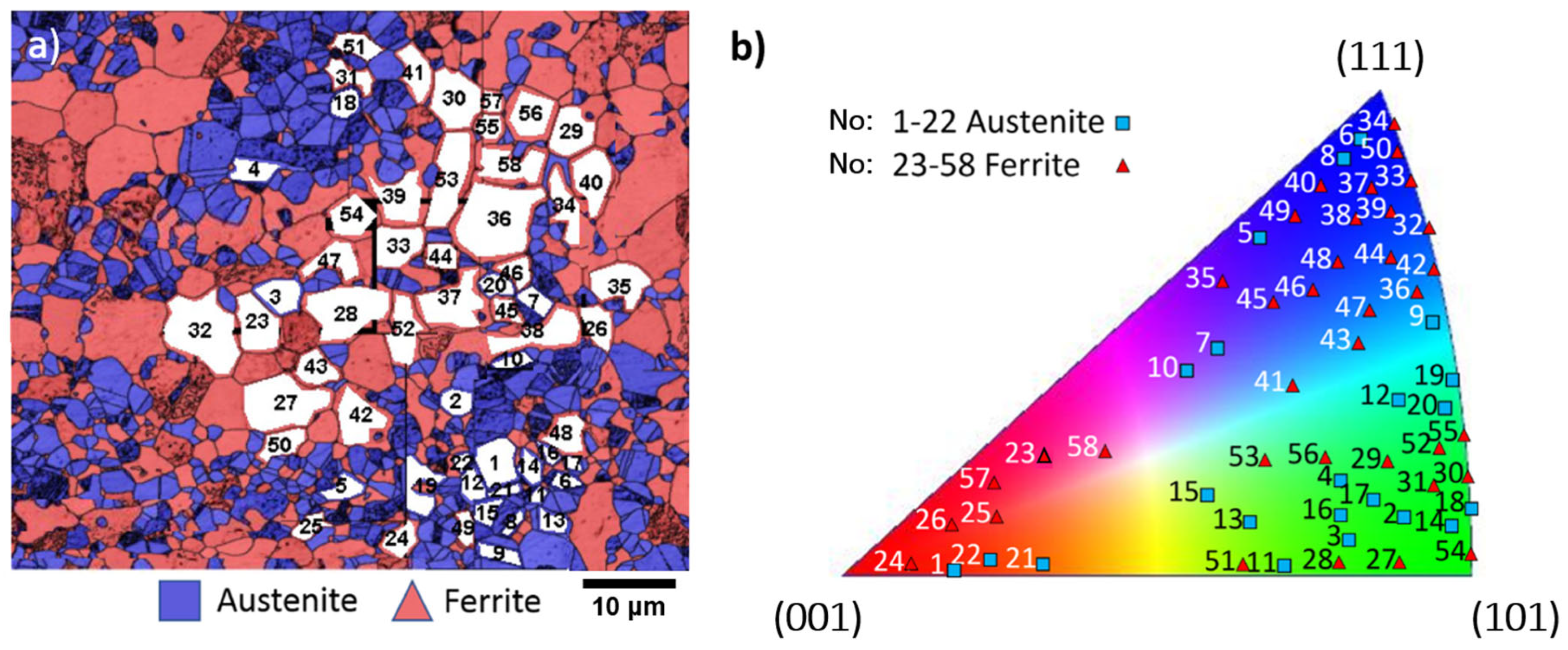 Figure 8. (a) EBSD phase image of the measured area with the austenite phase marked in blue and ferrite phase in red, and the grains selected for analysis are numbered and marked in white. Grains 1–22 are austenitic and 23–58 are ferritic. The crystallographic orientation of each grain is shown in the inverse polar figure in (b), with austenite grains marked as blue squares and ferrite grains as red triangles [103].