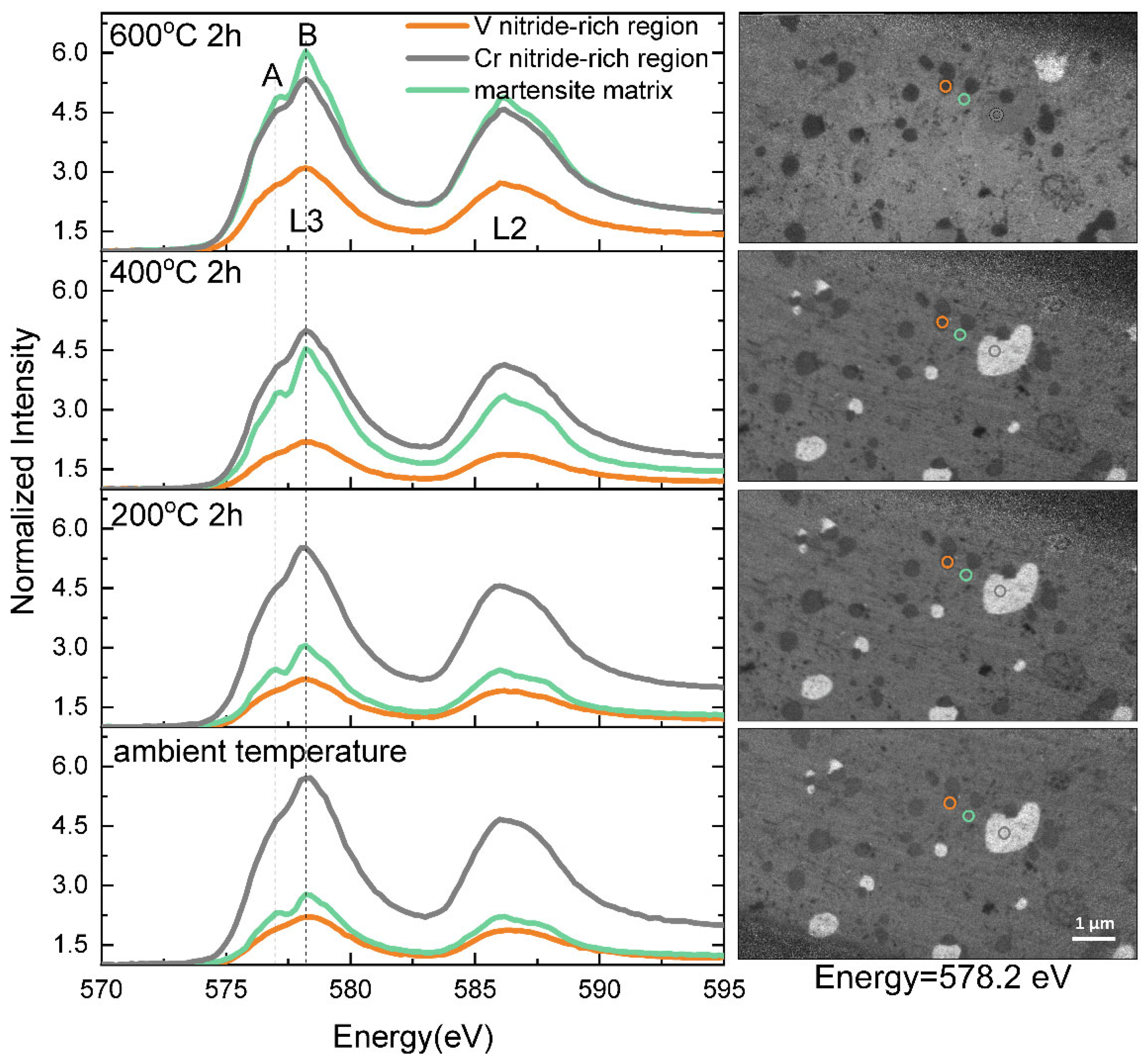Figure 10. Micro-XAS images at a photon energy of 578.2 eV and corresponding Cr L-edge XANES spectra extracted from the martensite matrix (green), V nitride-rich region (orange), and Cr nitride-rich region (gray), respectively, of the V- and N-containing martensite stainless steels at ambient temperatures of 200, 400, and 600 °C. The colored circles on the images indicate the marked regions from which the spectra were extracted [104].