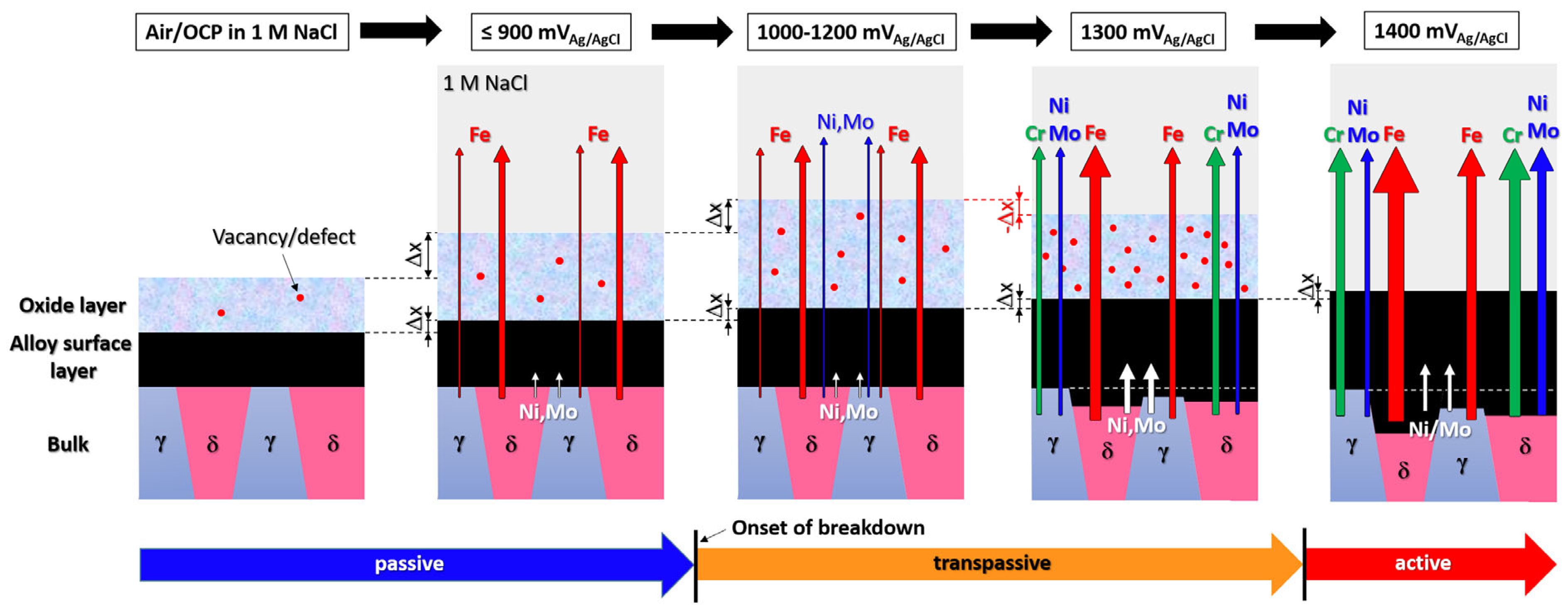 Passivity breakdown of Fe-base and Ni-base alloys is commonly believed to occur at a fixed potential (so-called breakdown potential) due to further oxidation of the stable Cr3+ in the passive film to soluble Cr6+ species. However, in electrochemical measurements, the increased anodic current due to oxygen evolution at high potentials may be misleading in the interpretation of the measured polarization curves. We have employed synchrotron-based XRD, XRR, and XRF techniques in a single experimental setup, operating in situ under electrochemical control, to study the passivity and breakdown of 2507 DSS in 1 M NaCl solution. Operando synchrotron X-ray measurements were performed at the ID03 beamline of the European Synchrotron Radiation Facility (ESRF) in France. The XRD in grazing incidence geometry probed the change in crystalline structure in the near-surface region, including the passive film and the underlying alloy layer. The XRR provided information on the thickness and density of the passive film. At the same time, the XRF detected the dissolved metal ions in the corrosive solution in the vicinity of the sample surface, all in real time. The applied potential was stepwise increased from the open-circuit potential, through the passive region, up to a high value of 1.4 V/Al/AgCl, where fast O2 evolution reaction occurs. Schematic illustrations of the experimental setup and the detailed measuring procedures are shown in the publication [105]. The combined XRR, XRD, and XRF results demonstrate that the passivity breakdown is a continuous degradation of the passive film over a specific potential range, accompanied by enhanced Fe dissolution before rapid Cr dissolution, caused by an increased potential. The breakdown process involves structural and compositional changes in both the passive film and the underlying alloy surface layer, as well as selective metal dissolution depending on the applied potential [105,106,107]. The passivity breakdown of the 2507 DSS started to occur around 1000 mV/Ag/AgCl, and Fe dissolved more from the ferrite than the austenite. Upon further increasing the potential, the passive film became thicker but less dense. In contrast, the underlying alloy surface layer became denser, indicating enrichment of Ni and Mo, and rapid Cr dissolution occurred at potentials greater than or equal to 1300 mV/Ag/AgCl [105]. These findings are schematically illustrated in Figure 11 below, which shows the different processes occurring in various potential regions.
