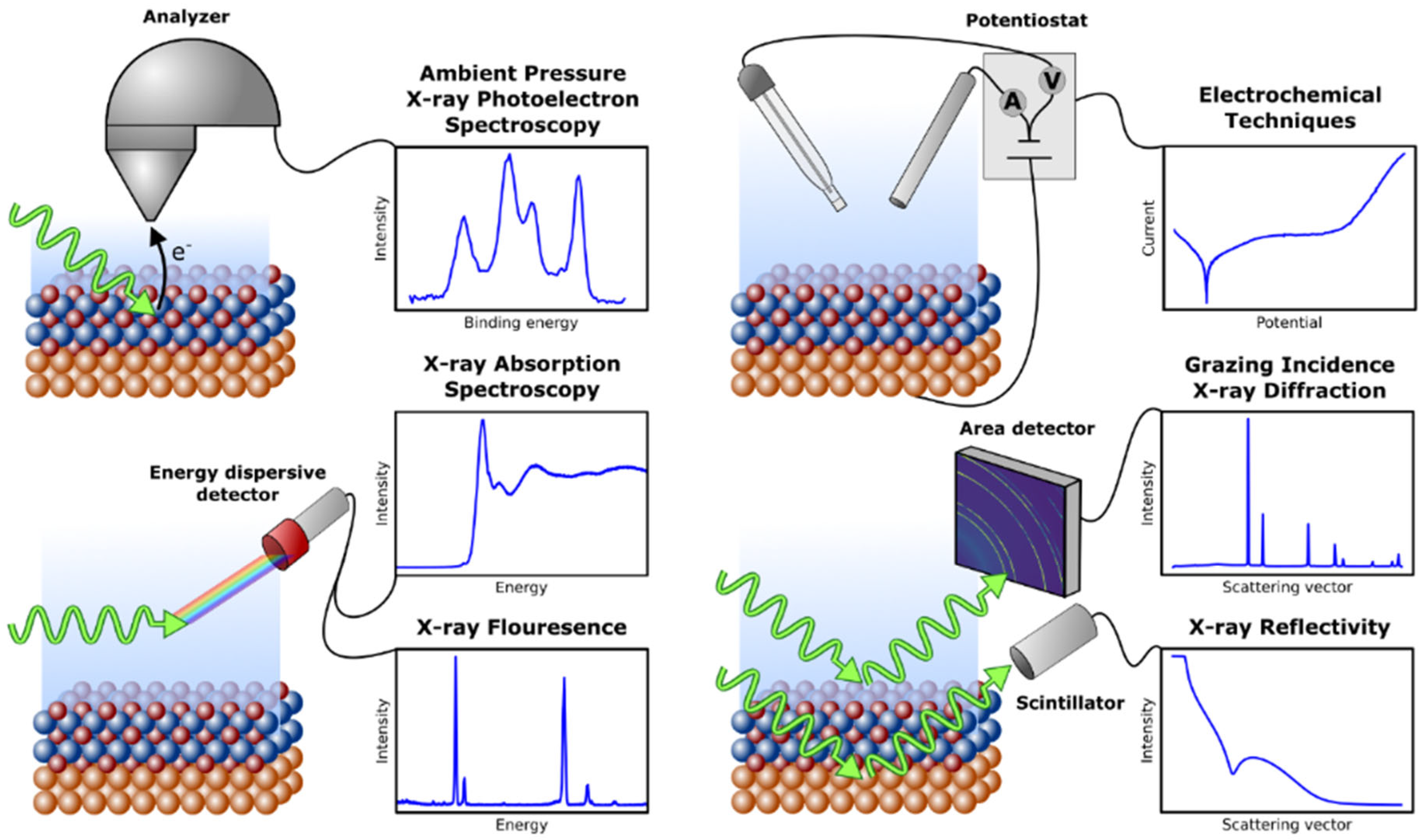 Figure 12. Schematic representation of the combination of experimental techniques. The orange atoms represent the metal, blue represents the metal cations, and red represents the oxygen anions in the oxide layer. XRR, XRF, and GI-XRD were integrated into one experimental setup. XANES and AP-XPS were measured in separate experiments [108].
