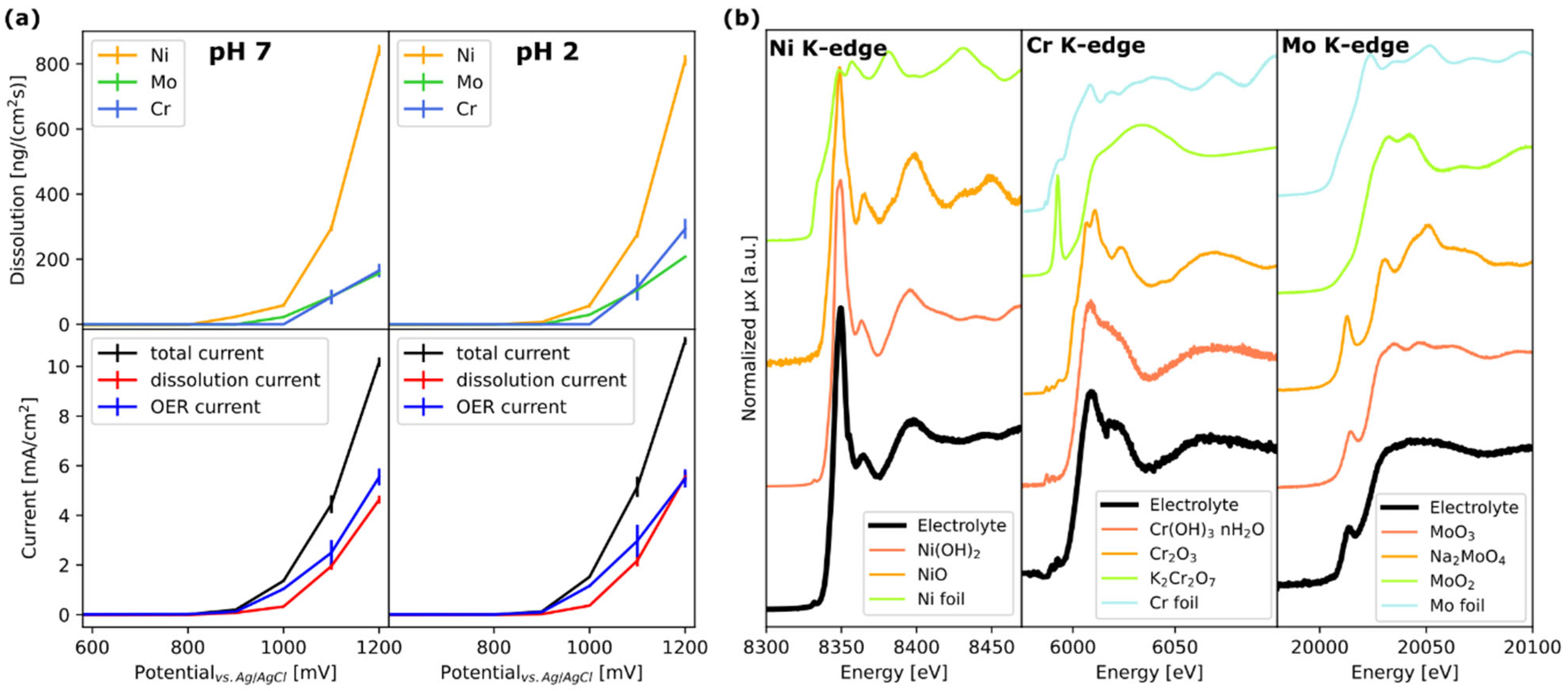 Figure 14. (a) (Top) Metal dissolution rate calculated from in situ XRF data. (Bottom) Dissolution current density and OER current density, compared to the total current density. (b) Chemical state determination of the dissolved species using in situ XANES (only for pH 7). Spectra of references are also shown for comparison [108].