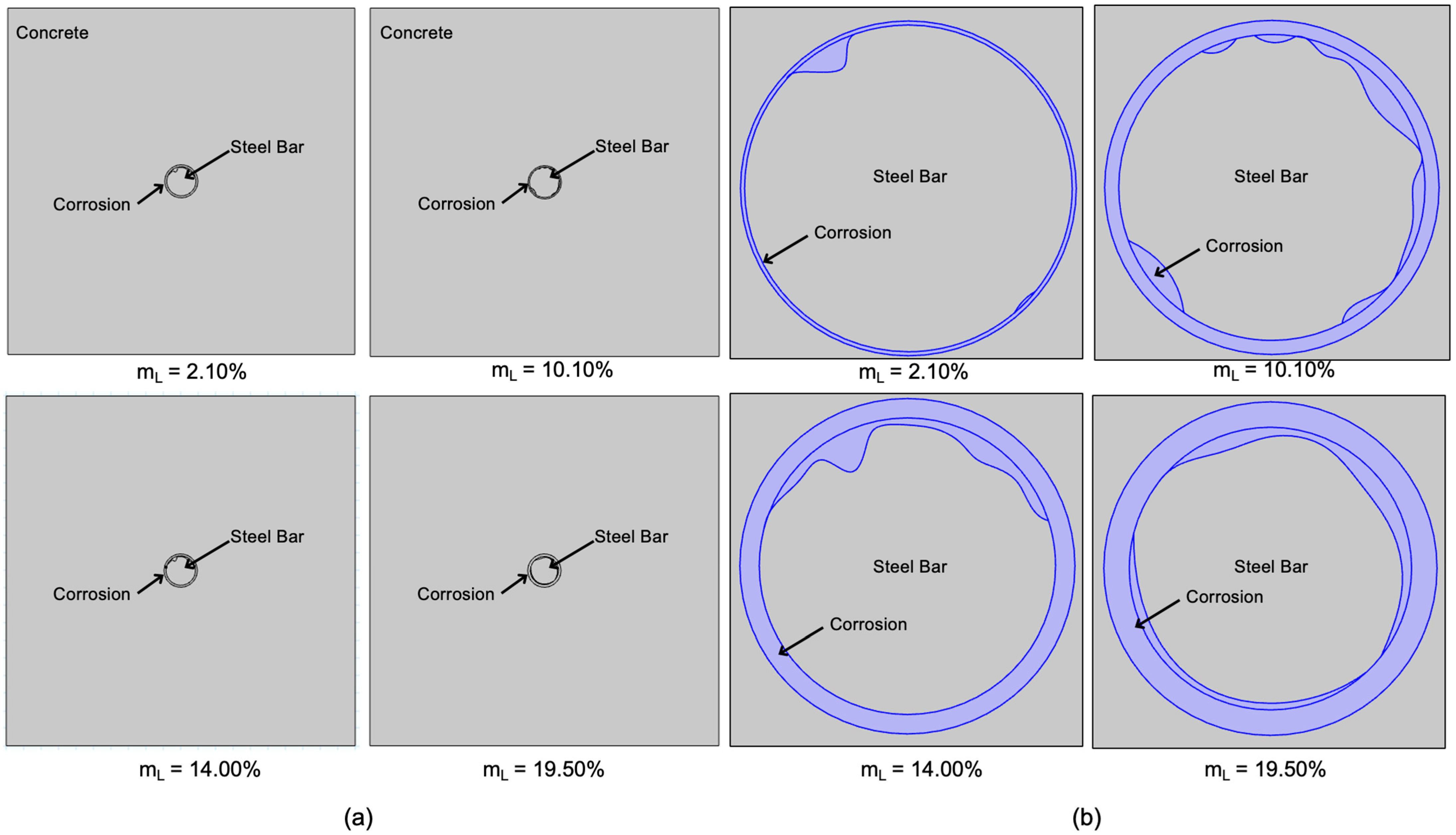 - Wang, X.G.; Zhang, W.P.; Gu, X.L.; Dai, H.C. Determination of residual cross-sectional areas of corroded bars in reinforced concrete structures using easy-to-measure variables. Constr. Build. Mater. 2013, 38, 846–853. [Google Scholar] [CrossRef]