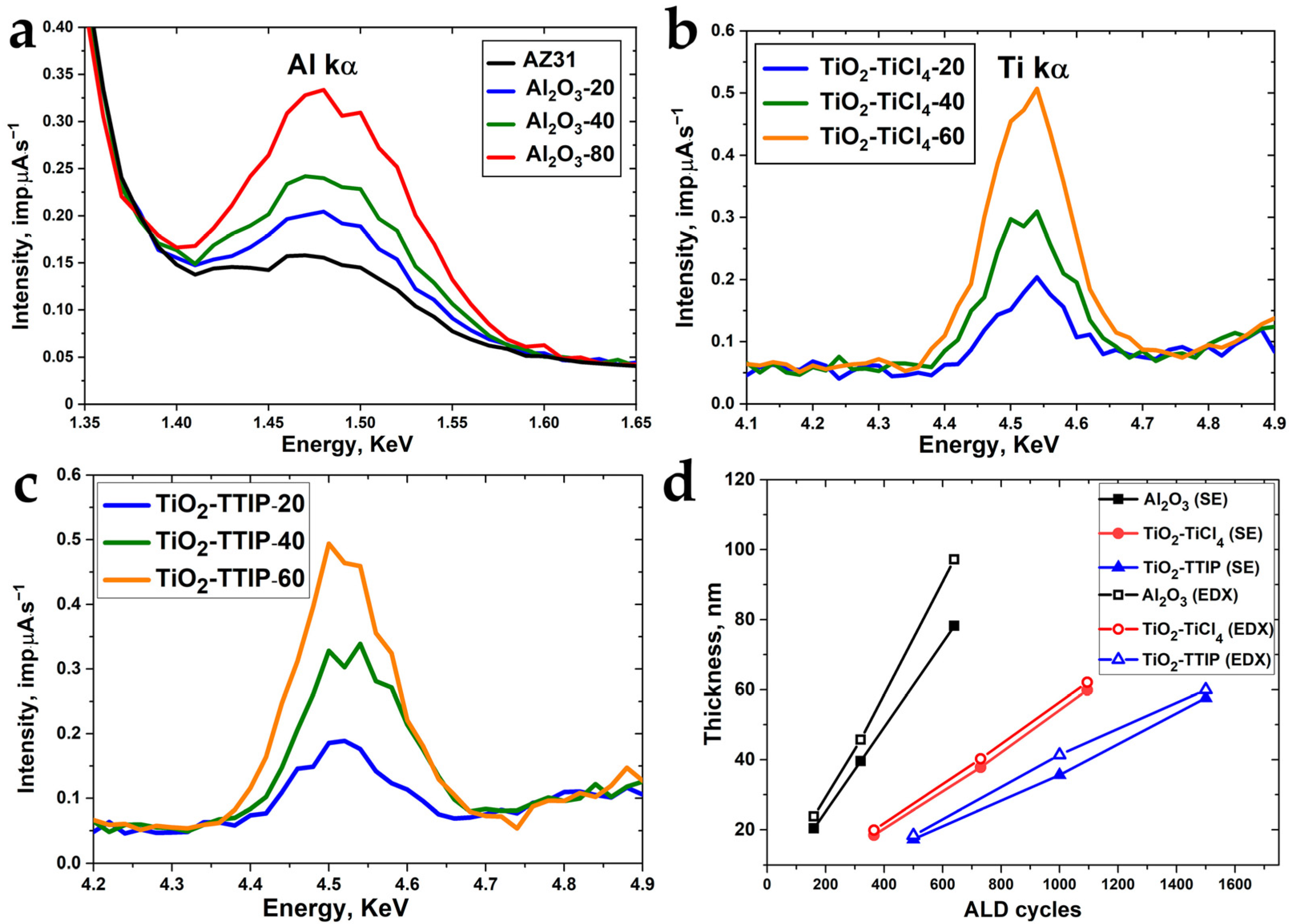 - Kozlova, L.A.; Vartiajnen, V.V.; Kirichenko, S.O.; Rytova, M.A.; Godun, A.P.; Kolesnichenko, Y.V.; Yudintceva, N.M.; Kalganov, V.D.; Lozhkin, M.S.; Morozova, N.E.; et al. Regulation of biocorrosion of AZ31-type magnesium alloy by atomic layer deposition of Al2O3 nanocoatings. Surf. Interfaces 2025, 69, 106775. [Google Scholar] [CrossRef]