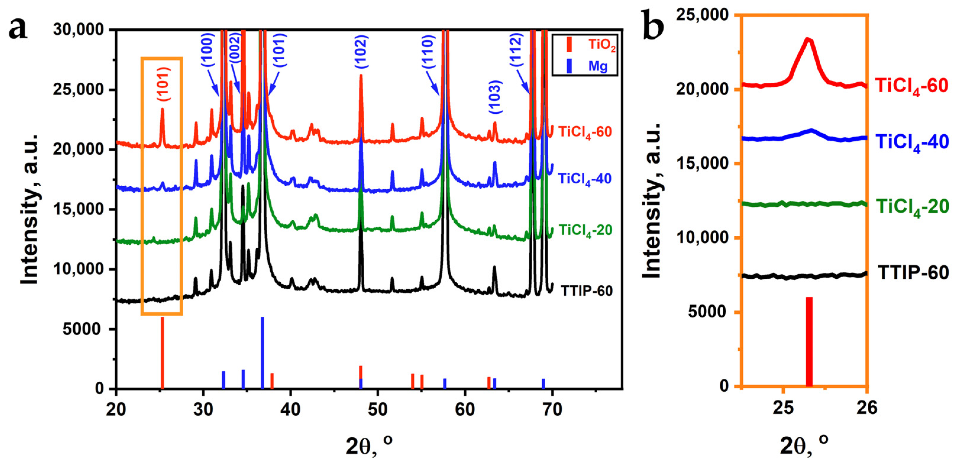 - Mashtalyar, D.V.; Imshinetskiy, I.M.; Kashepa, V.V.; Nadaraia, K.V.; Piatkova, M.A.; Pleshkova, A.I.; Fomenko, K.A.; Ustinov, A.Y.; Sinebryukhov, S.L.; Gnedenkov, S.V. Effect of Ta2O5 nanoparticles on bioactivity, composition, structure, in vitro and in vivo behavior of PEO coatings on Mg-alloy. J. Magnes. Alloys 2024, 12, 2360–2379. [Google Scholar] [CrossRef]