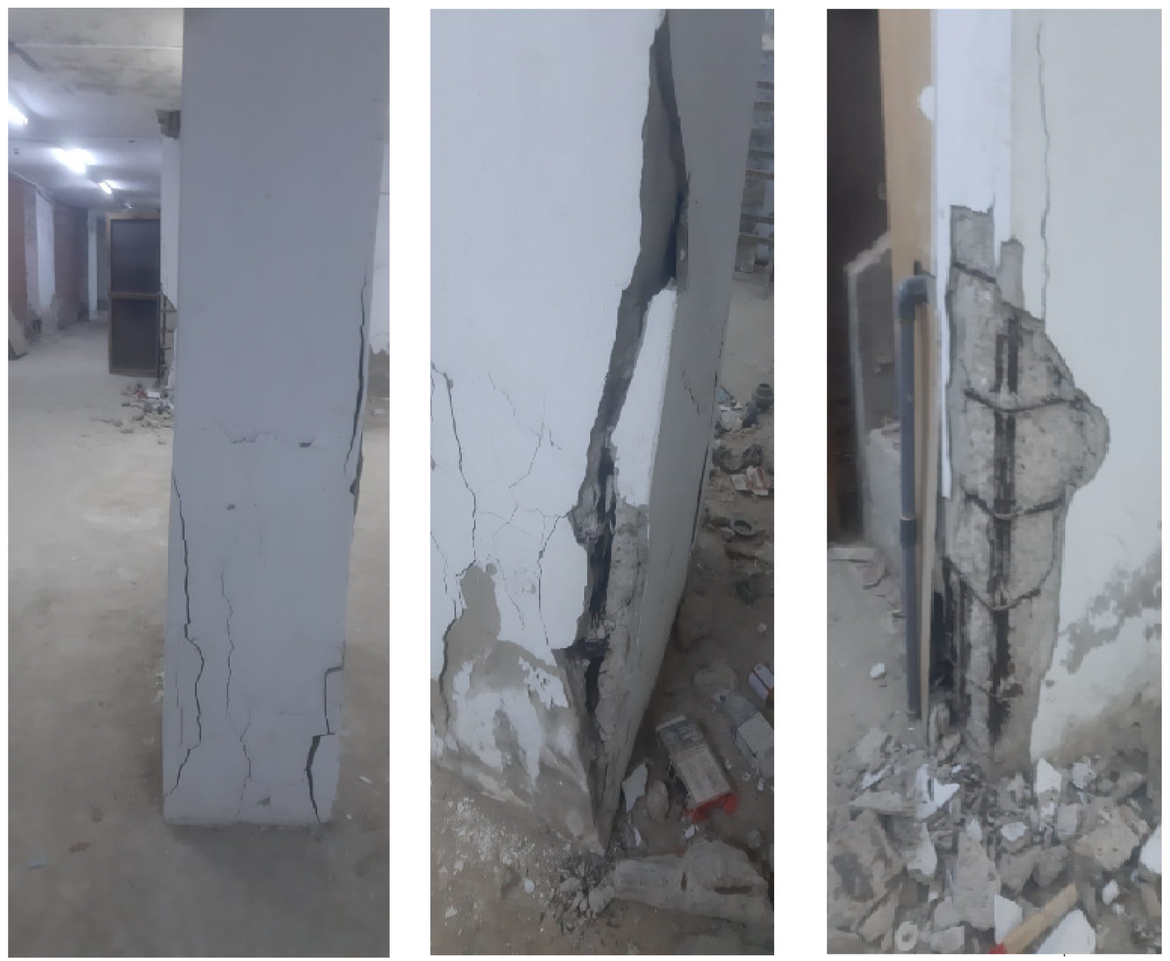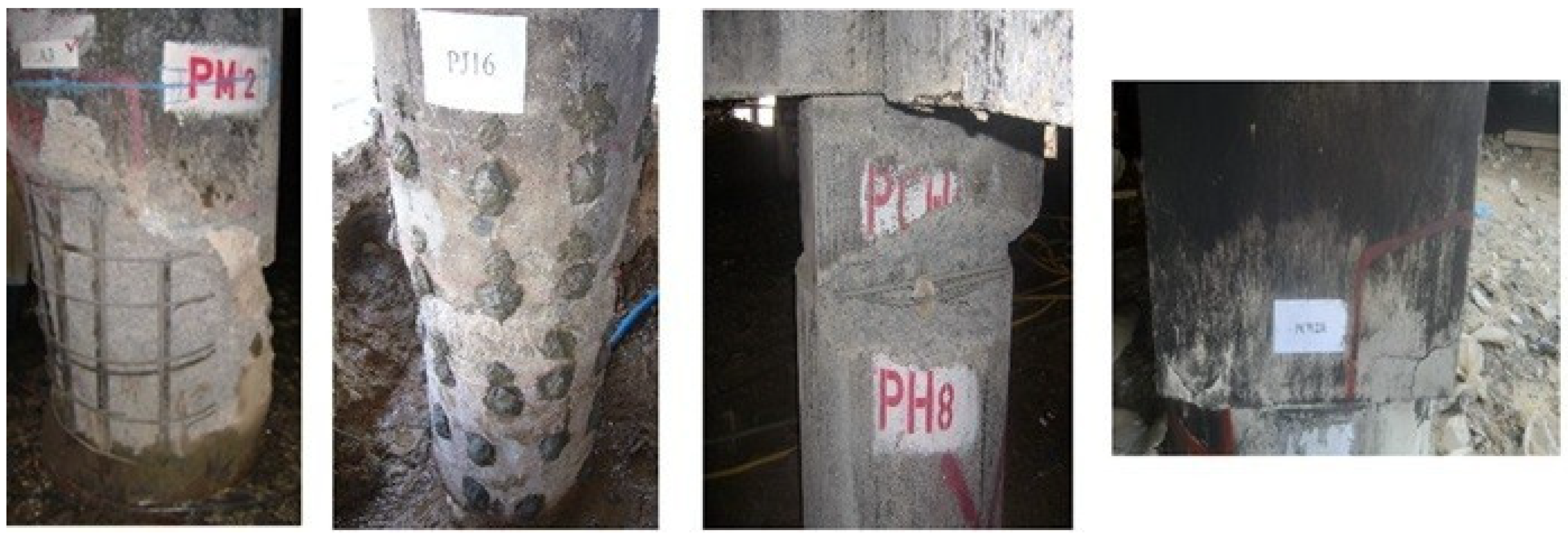 The restoration technology was applied to specific, critically damaged locations. For instance, for columns, strengthening targeted the lower 1–2 m within the tidal/splash zone where damage was concentrated. For beams, this included the sides, soffits and bottom corners exhibiting flexural cracks and the regions of beam–column joints. For pile caps, interventions focused on the spalled horizontal surfaces and vulnerable edges. The execution followed a rigorous sequence to ensure monolithic integration. Subsequent to surface preparation and corrosion mitigation of the existing reinforcement, a doweling technique was employed as follows: holes were drilled into the sound concrete surrounding the repair zone, cleaned, and injected with a high-strength, low-viscosity epoxy resin. Supplementary reinforcement, consisting of epoxy-coated steel bars (Grade 420 MPa/Grade 60) with diameters of 12 mm (for ties/stirrups) and 16 mm (for longitudinal bars), was then grouted into place. This newly installed, corrosion-protected steel cage was designed to restore and enhance the sectional capacity. Temporary formwork was then installed to match the original element geometry. The fluid, self-consolidating micro-concrete was placed via pump or tremie to ensure complete encapsulation of the new reinforcement and a void-free bond with the prepared substrate, a process illustrated for beams and slabs in