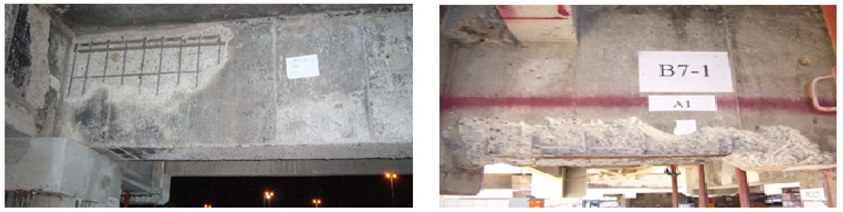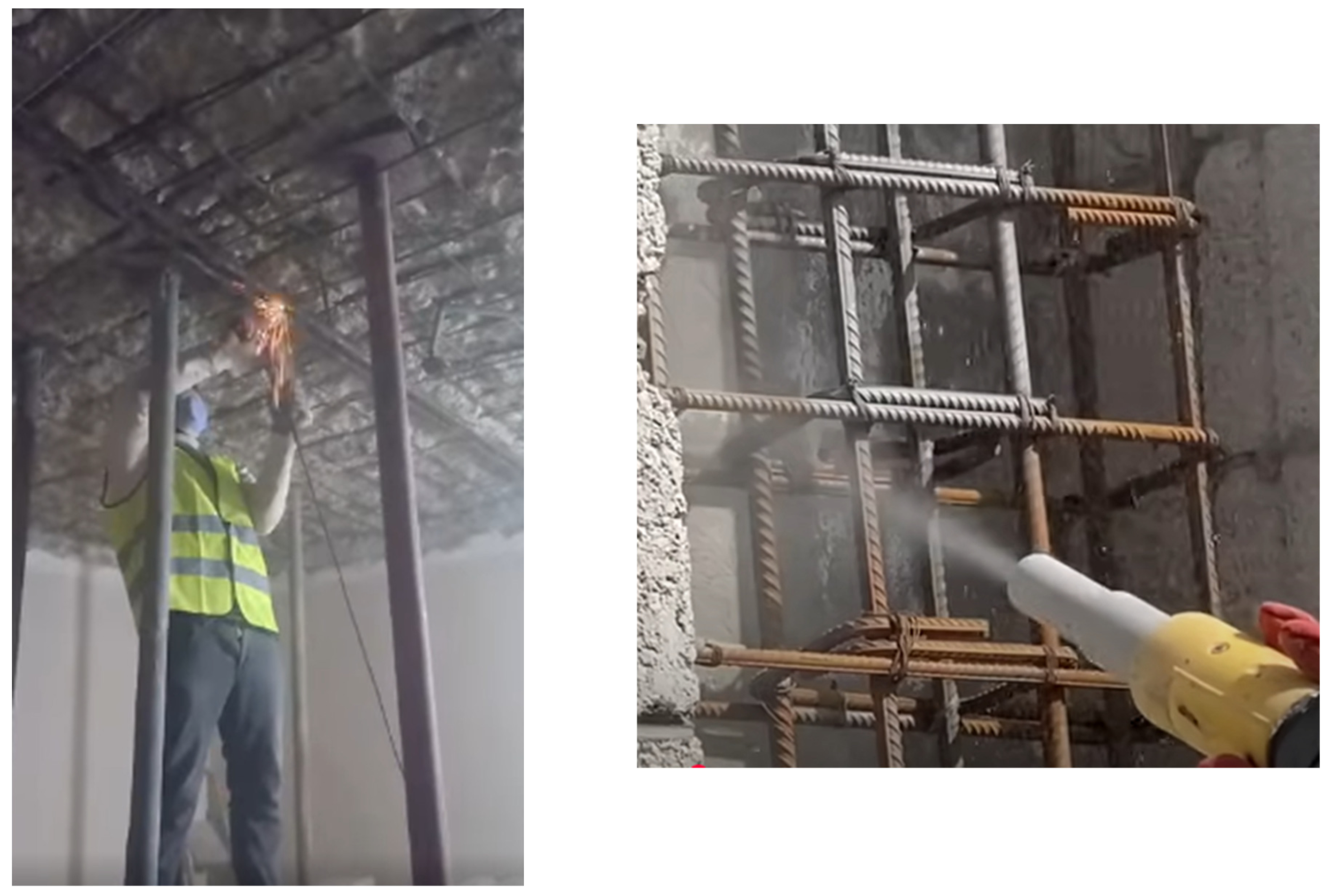 Figure 6 showing corrosion removal from reinforcement bars. The process involved thorough cleaning of affected surfaces to remove contaminants, including dirt, rust, scale, and grease, that could compromise adhesion. Both manual and mechanical cleaning techniques were employed to achieve optimal surface conditions. Grit blasting was extensively used to remove deteriorated concrete layers and expose a sound substrate suitable for repair applications, while also effectively removing corrosion products from steel reinforcement surfaces. All defective concrete was carefully removed to prevent future delamination, with severely damaged reinforcement bars either replaced or treated using a zinc-rich epoxy primer before embedding them in the repair material. The presence of these materials on the concrete and reinforcement surfaces could compromise adhesion and hinder the performance of repair materials, making it essential to achieve a clean substrate. The selection of the appropriate blasting method was based on the severity of deterioration and the accessibility of different structural components. Once blasting was completed, all debris and loose particles were meticulously removed to prevent contamination of repair materials. This step was vital in achieving strong bonding between new materials and the existing structure.