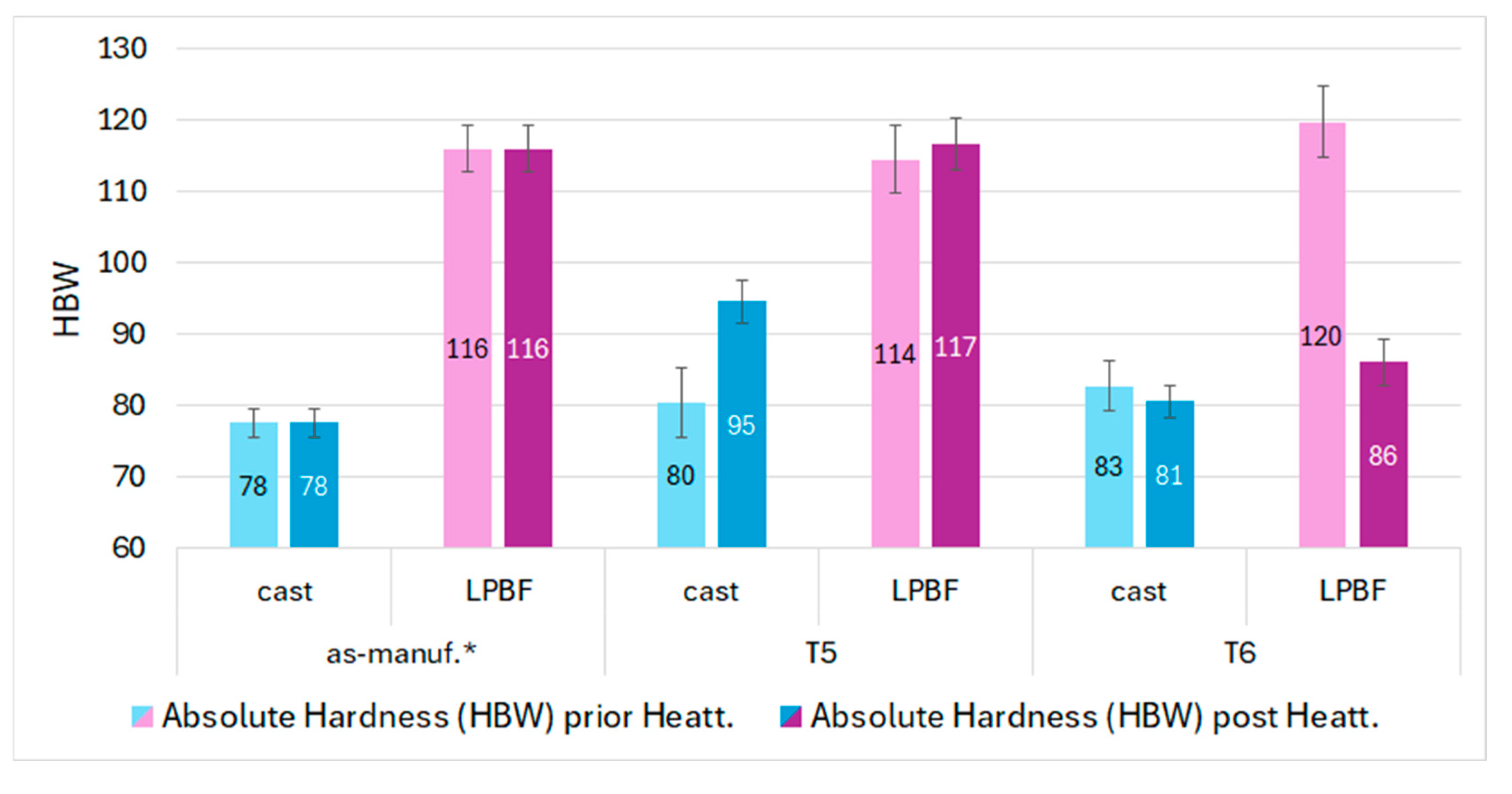 - T6 heat-treated LPBF samples showed lower hardness values than under as-manufactured conditions, which is likely due to overaging during precipitation hardening.