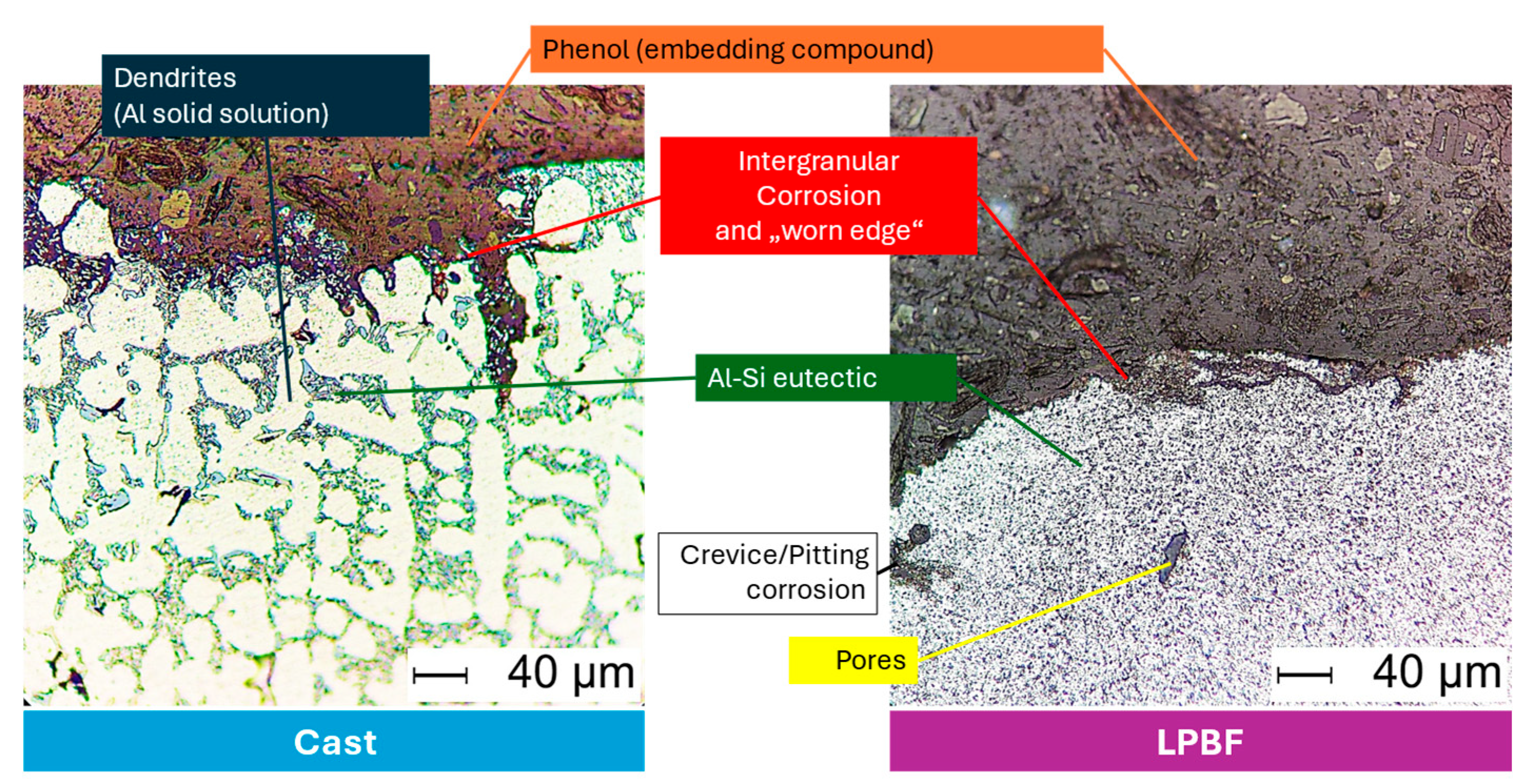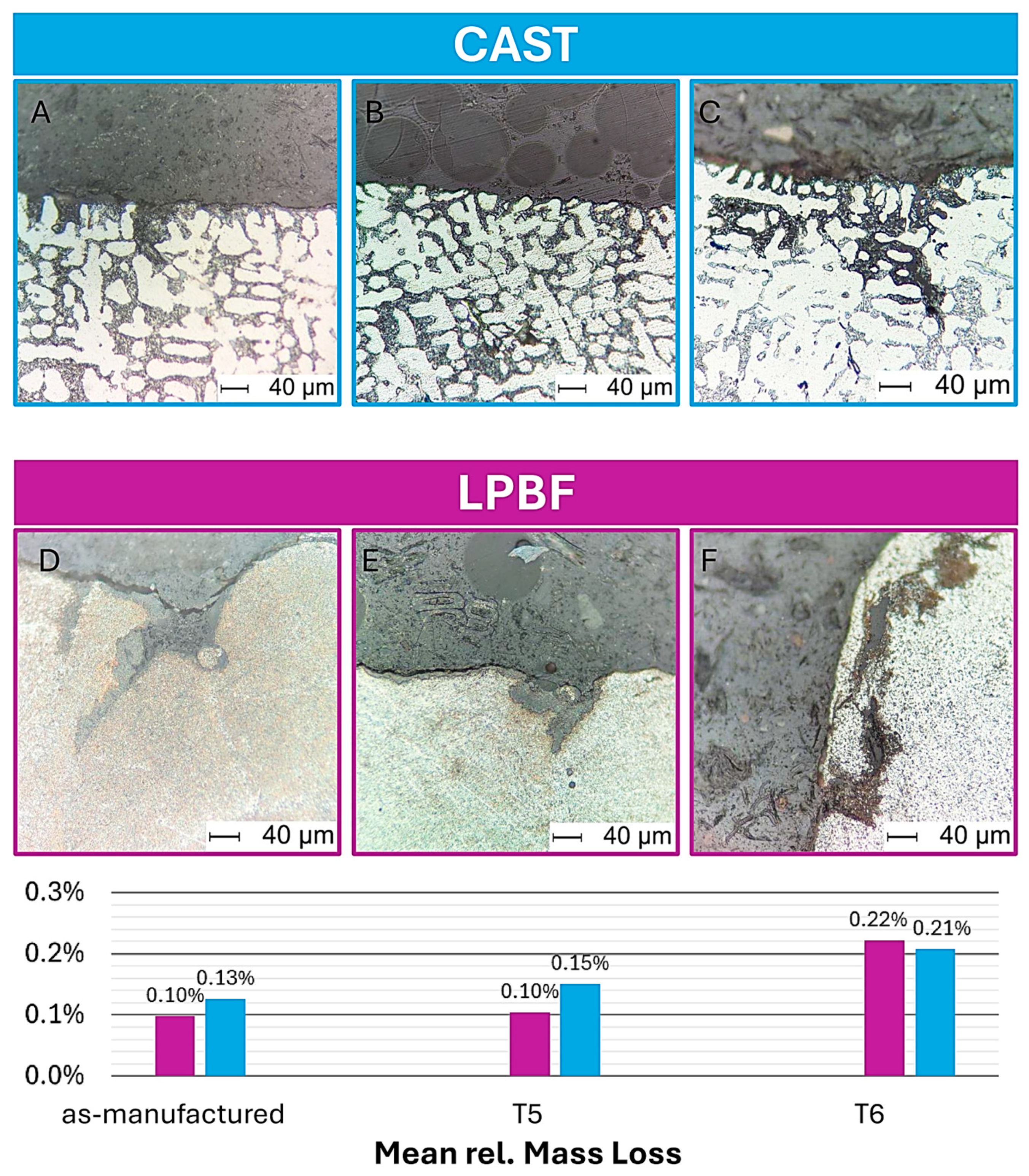 - Microstructural differences between LPBF and cast AlSi10Mg appear to influence initial corrosion stages. Under the tested conditions, the fine LPBF structure favors localized pitting, whereas the coarser cast structure suggests a higher susceptibility to localized galvanic effects confined to phase contact zones during cyclic exposure.