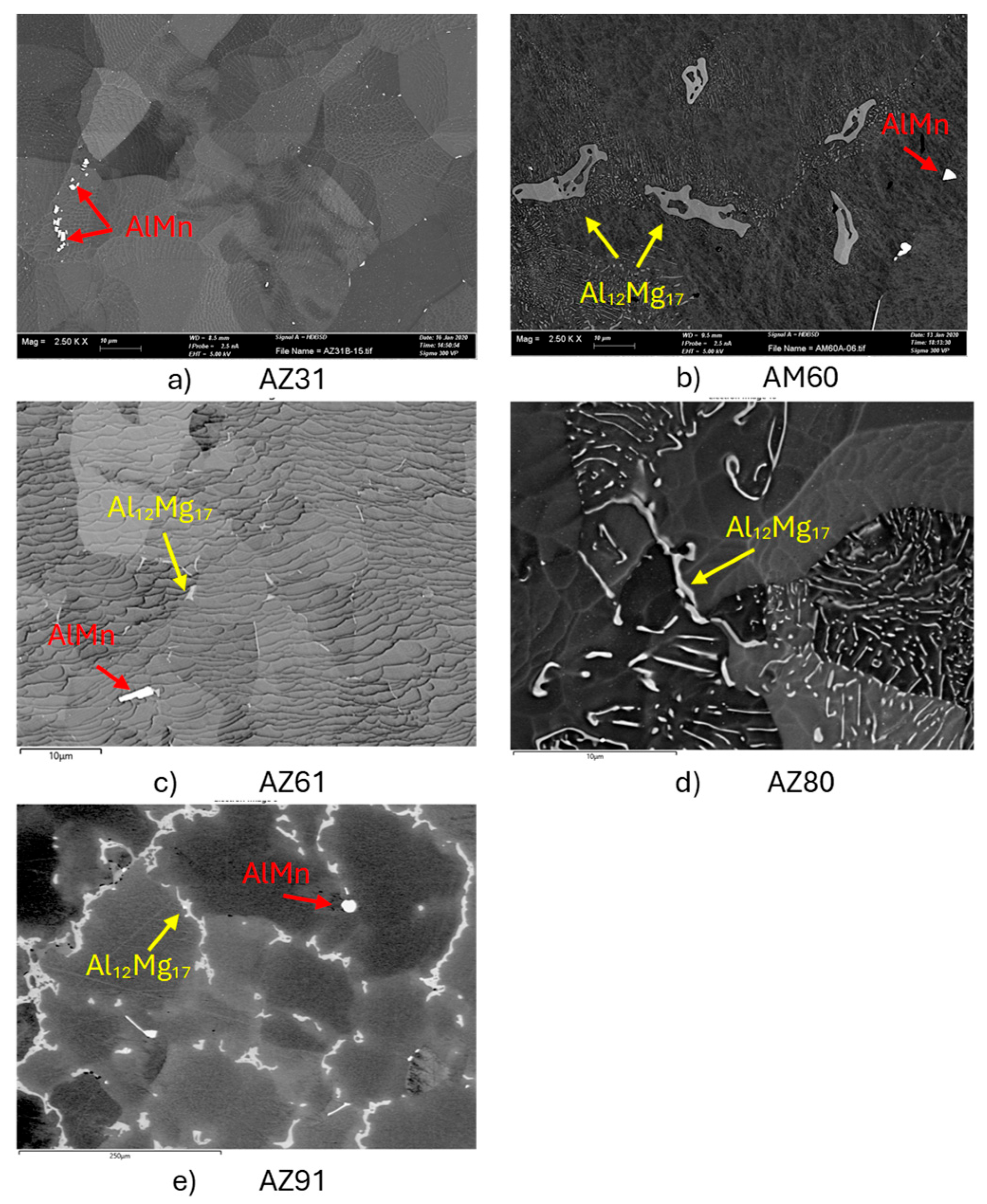 | AZ91 | >200 | 12–15 | Al12Mg17, AlMn and Mg2Si |