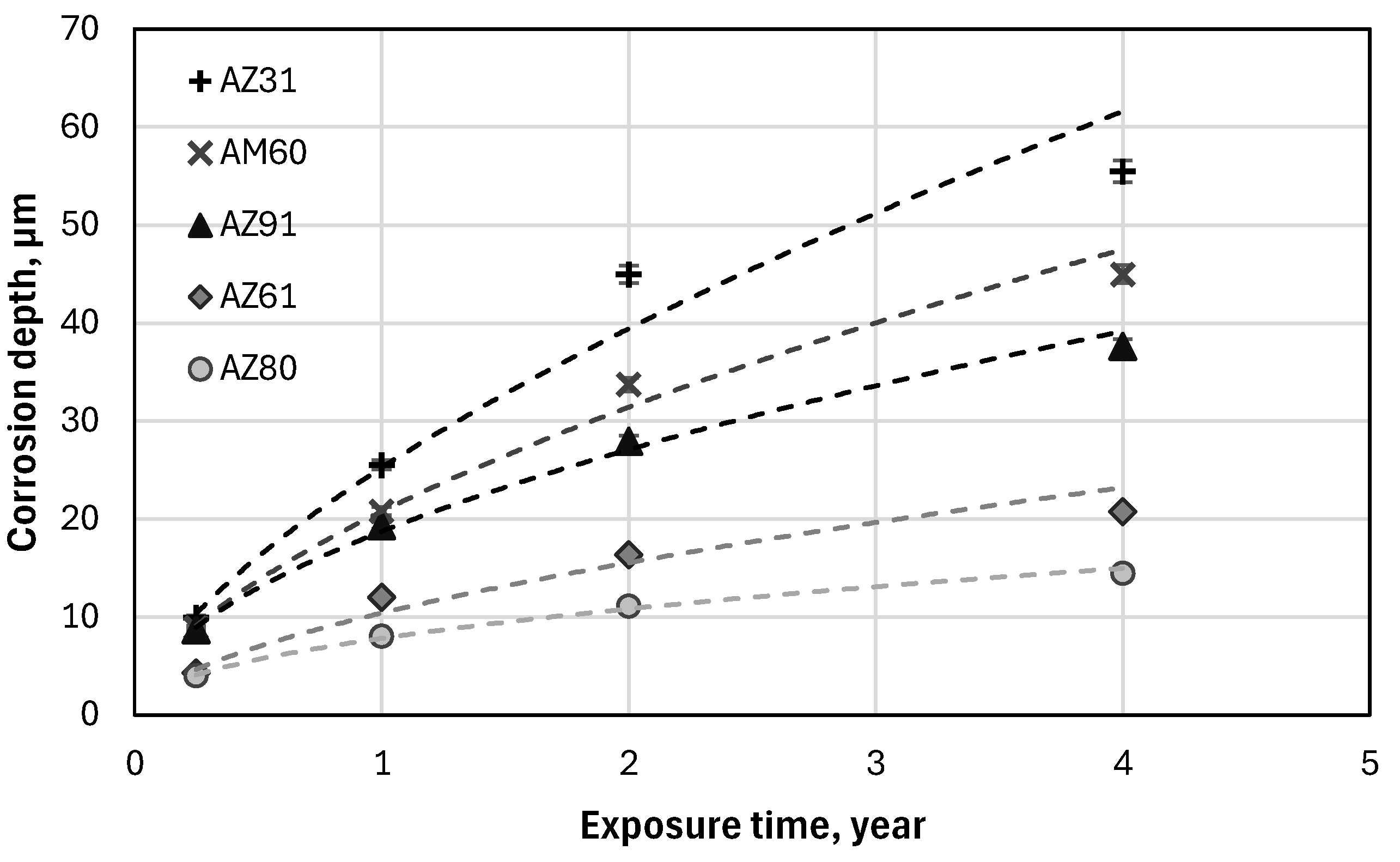 - Based on weight loss measurements, the corrosion performance of the magnesium alloys under harsh marine conditions studied in this work increased in the following order: AZ31 < AM60 < AZ91 < AZ61 < AZ80. The ranking was similar for all exposure times, ranging from 3 months to 4 years.