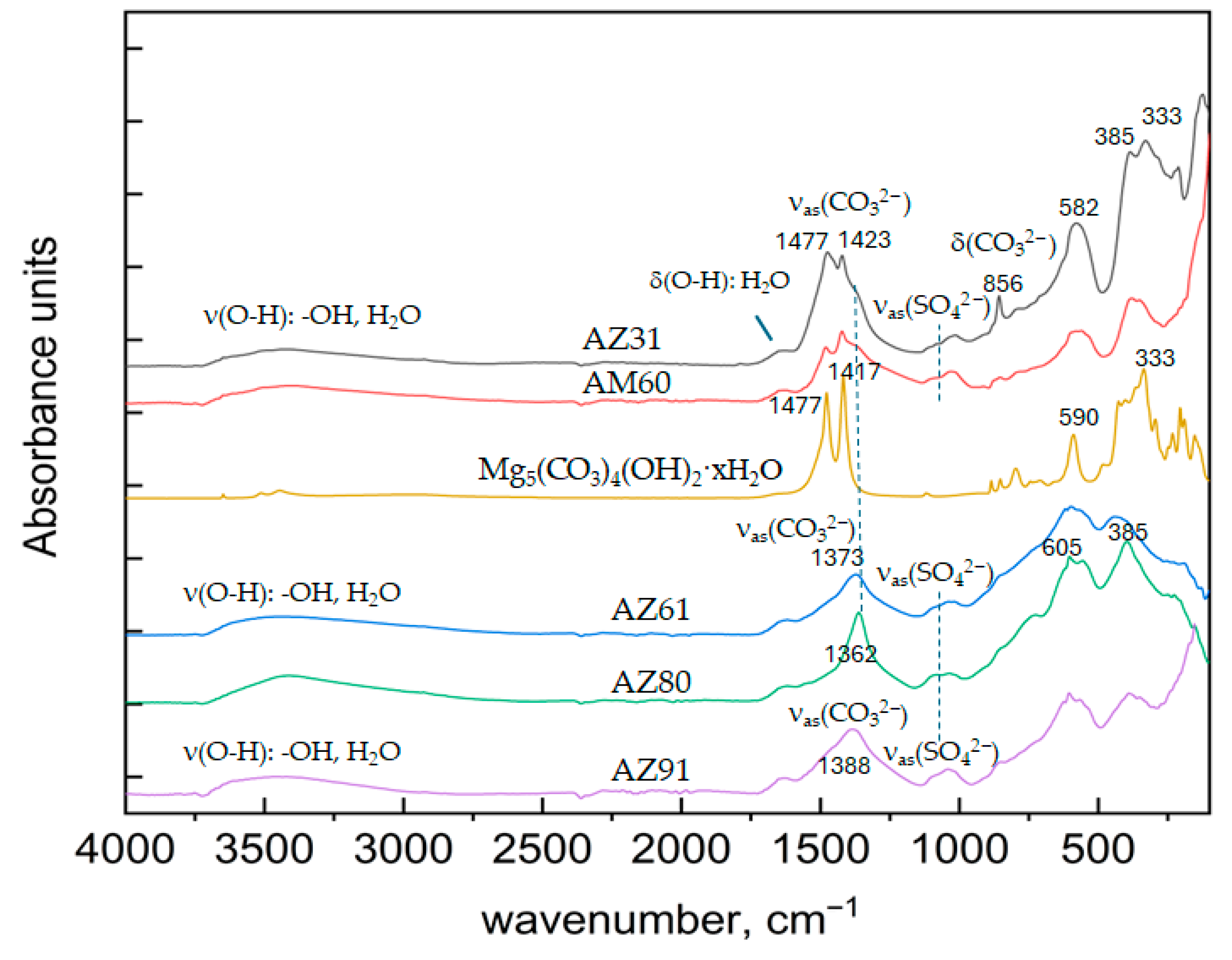 - Persson, D.; Wärnheim, A.; Le Bozec, N.; Thierry, D. Studies of Initial Atmospheric Corrosion of Magnesium Alloys AZ91 and AZ31 with Infrared Spectroscopy Techniques. Corros. Mater. Degrad. 2025, 6, 59. [Google Scholar] [CrossRef]