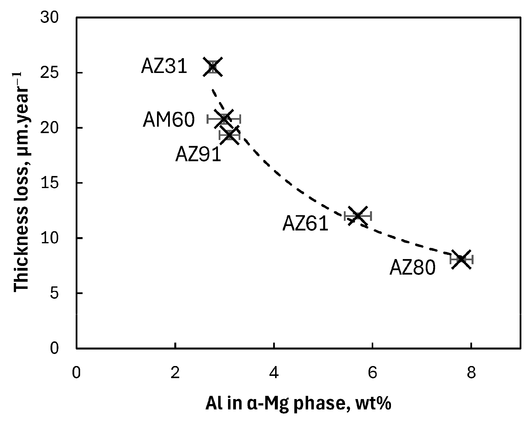 - A clear correlation between the Al content in the α-Mg phase and the corrosion loss was observed, indicating that this parameter is strongly governing the corrosion rate of magnesium alloys under atmospheric corrosion conditions.