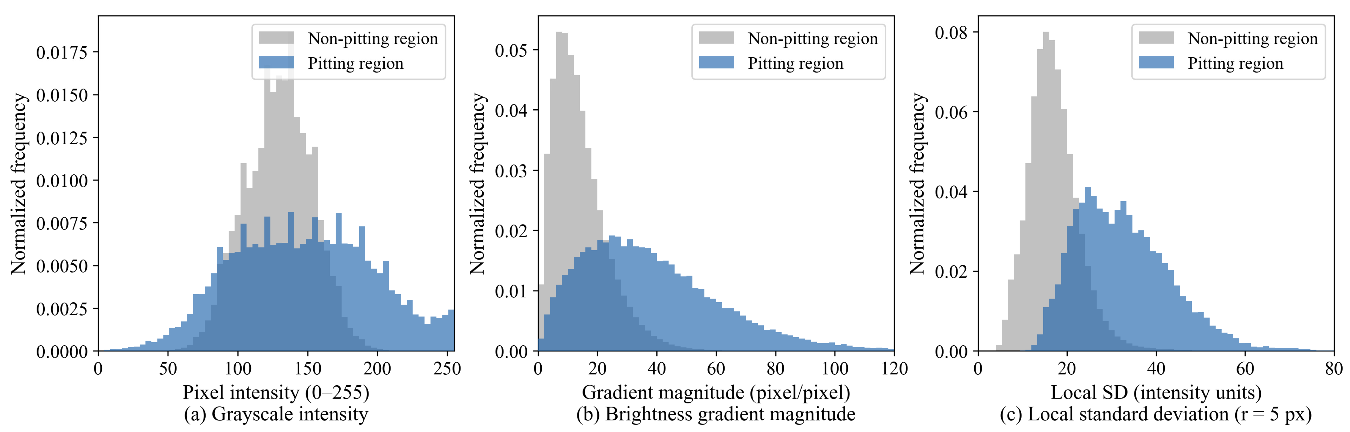 To supplement this definition with quantitative evidence, pixel-level statistics were computed from the annotated dataset. As shown in Figure 3a, the grayscale intensity distributions of pitting corrosion (mean ± SD: 146.5 ± 49.3) and non-pitting corrosion regions (129.1 ± 23.8) partially overlap, indicating that only intensity is insufficient for unambiguous discrimination. By contrast, Figure 3b shows that pitting regions exhibit substantially higher brightness gradient magnitudes (38.3 ± 23.5 pixel/pixel) than non-pitting regions (14.0 ± 9.1 pixel/pixel), corresponding to a 2.73 times difference. Similarly, Figure 3c shows that the local intensity standard deviation within a 5-pixel radius is 1.92 times higher in pitting regions (32.6 ± 10.6) than in non-pitting regions (16.9 ± 5.6). Kolmogorov–Smirnov tests confirm that all distributions differed significantly between the two regions (all p < 0.001). These differences reflect the physical nature of pitting, as light incidence on a cavity creates a dark center/bright halo pattern with a steep luminance transition at the pit boundary, resulting in higher local gradient and texture contrast compared to the surrounding intact surface.
