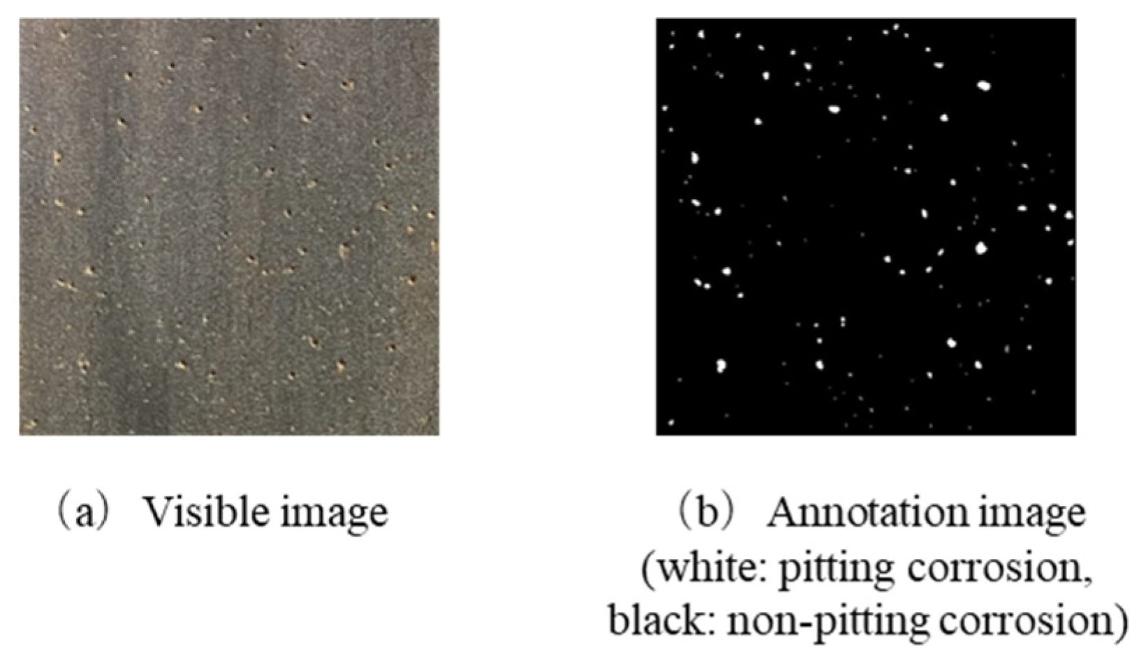 The annotation work was performed using dedicated image annotation software [30]. The annotation process began by loading visible images. Pitting corrosion areas were then manually identified and marked through careful visual inspection. Following this identification process, binary mask images were created with each pixel assigned either 0 for non-pitting areas or 255 for pitting areas. Finally, quality checks and verification of annotations were conducted to ensure accuracy and consistency.