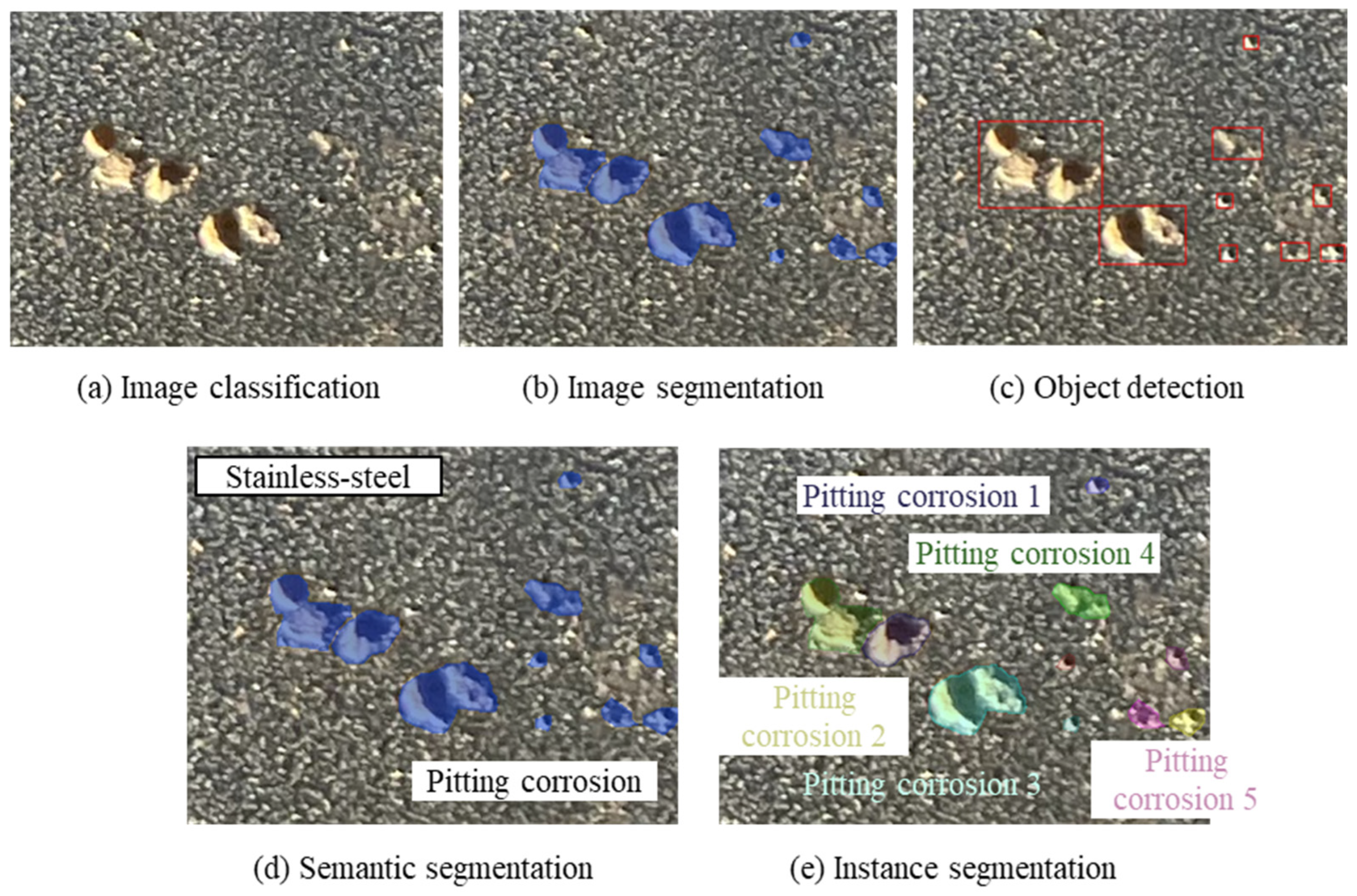 To define specific tasks, it is necessary to consider the characteristics of the available training dataset. In this study, visible images that can be easily collected are used as input data, and annotation data is manually created from the visible images. The deep learning method to be adopted was selected based on the amount of the available data, required accuracy, and implementation feasibility. The conditions are set as follows: two region-of-interest images are available, the required accuracy exceeds that of conventional image processing methods, and an implementable deep learning model. The original photographs captured on-site contained non-uniform surface conditions, including areas with surface contamination and structural irregularities unsuitable for corrosion analysis; therefore, representative regions of approximately 60 mm × 270 mm were manually extracted from each original photograph, with one region per steel grade (SUS410 and SUS430), focusing on the exposed surfaces with confirmed pitting corrosion. These two cropped images serve as the basis for all subsequent deep learning procedures. The limited number of available original images reflects the restricted availability of stainless-steel sheet pile installations with sufficient service history to exhibit detectable pitting corrosion under real-world conditions. The accuracy of deep learning has improved in various domains such as image recognition, natural language processing, video analysis, and speech recognition, bringing innovation to machine learning [25]. This success is not only due to the ongoing development of methods but also to the preparation of large-scale datasets and the cost reduction in GPUs that enable high-speed numerical computation. As there are basic tasks (Figure 5 and Table 2) for deep learning targeting images, optimal task selection according to purpose is important.