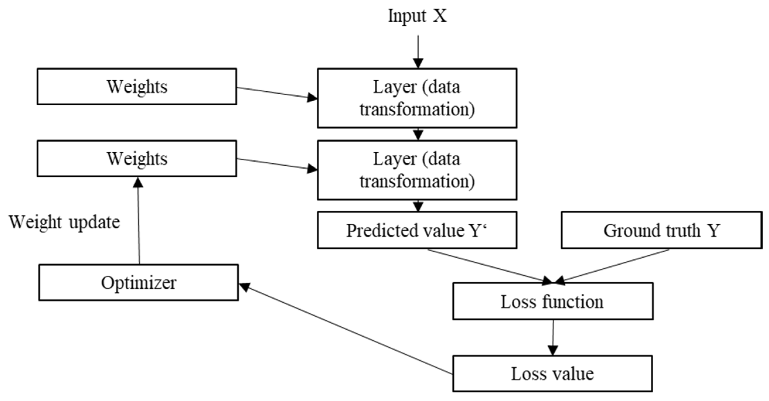 The deep learning model used in this study is U-net [28], which is a type of Fully Convolutional Network (FCN). FCNs are neural networks only consist of convolutional layers and pooling layers without fully connected layers. U-net is widely used as a basic semantic segmentation model. Deep learning is a mechanism that maps input values such as images to predicted values such as labels (Figure 7). The processing that a layer performs on input data is stored in the weights of that layer. The process of learning involves finding the optimal values of weights in all layers of the network so that the input values are accurately mapped to the corresponding target values. To control something, it must first be observable; that is, to control the output of a model, it is necessary to measure how much the output deviates from the expected value. This measurement is performed by the model’s loss function. The loss function is calculated from the model’s predicted values and ground truth values, when then quantifies the model’s performance for that sample. The basic principle of deep learning is to use this loss value as a feedback signal to fine-tune the weight values. The adjustment of weights is performed in the direction that reduces the loss value for the current sample. The optimizer is responsible for executing this adjustment process [31].