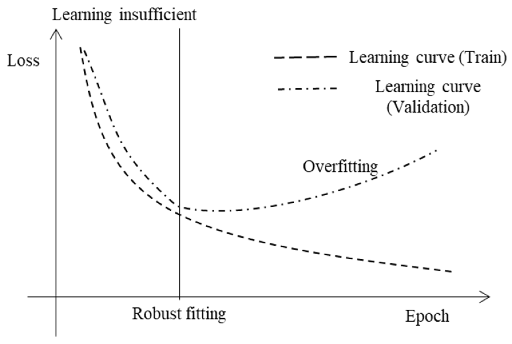 When adjusting the model, it is necessary to pay attention to overfitting and generalization. Overfitting is a phenomenon in which the model shows high performance during training; however, the performance can decrease with unknown data. Generalization refers to the performance when a trained model is executed on unknown data, and improving this generalization performance is a major goal in machine learning. Figure 10 shows the relationship between the training time and loss value. During the model adjustment process, the loss value on the validation data initially decreases as the training progresses, but after reaching a minimum value at a certain point, it tends to increase again. Immediately after the start of training, as the loss value on the training data decreases, the loss value on the validation data also decreases. At this stage, learning is insufficient, and there is still room for improvement in the model (underfitting state); however, when learning on the training data exceeds a certain number of times (epochs), generalization performance no longer improves, and the loss value on validation data begins to increase. This stage indicates that overfitting has begun. A model in an overfitting state can learn the patterns and noise specific to the training data, resulting in decreased prediction performance for unknown data. Identifying the point at which the model achieves maximum generalization performance—that is, the boundary between underfitting and overfitting—is one of the most important factors for maximizing the final model performance. To find this point, methods such as “early stopping”, which periodically evaluates the validation data during training and stops training when the loss value is minimized, have been effective.