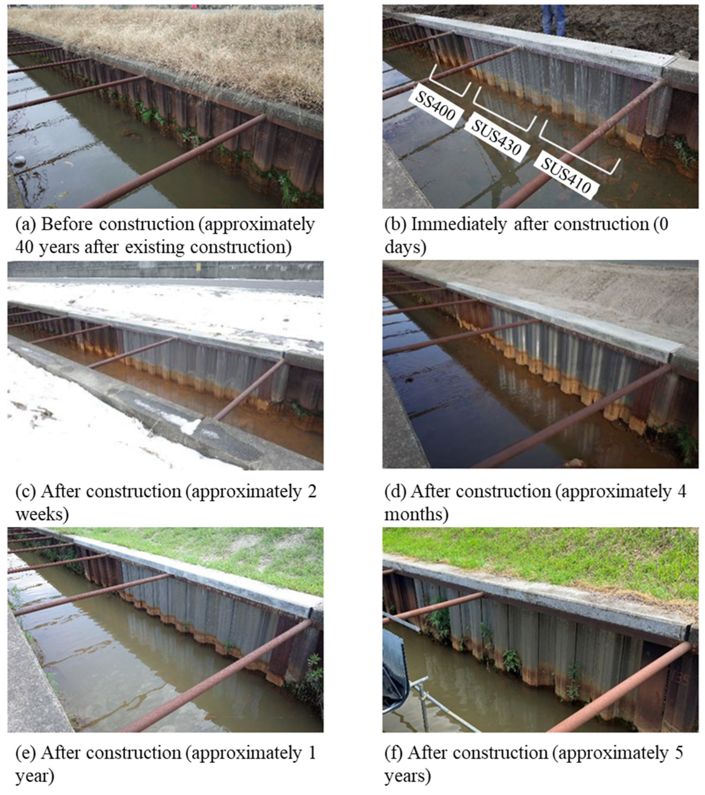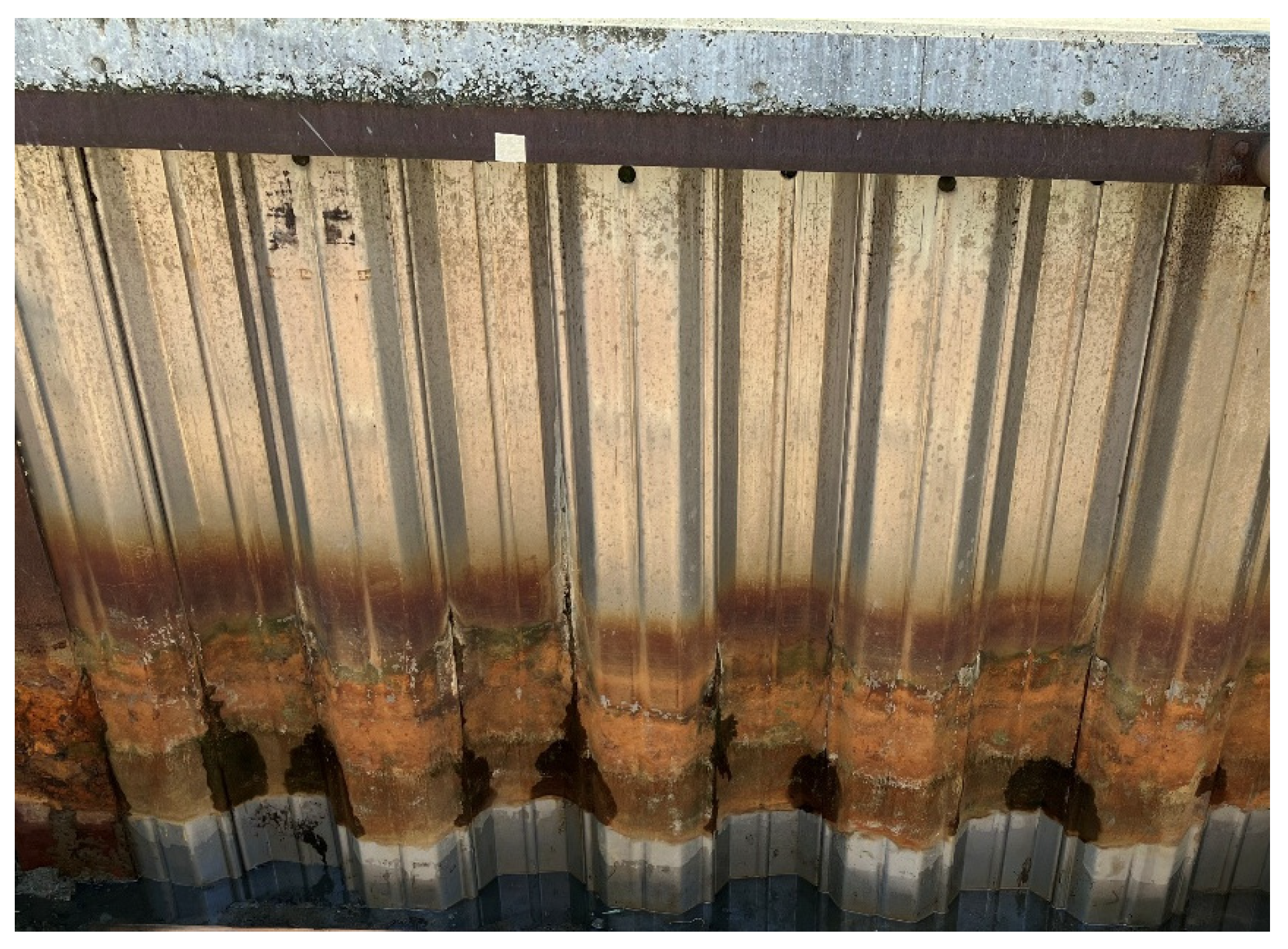 Both materials exhibit high corrosion resistance due to their passive films, with corrosion primarily manifesting as localized corrosion, such as pitting corrosion and crevice corrosion, rather than the uniform corrosion observed in ordinary carbon steels. This localized corrosion behavior is characteristic of stainless steels, where the passive film provides excellent general protection but remains vulnerable to breakdown at specific sites under aggressive conditions, such as high chloride concentrations. For comparison purposes, ordinary steel (SS400) sheet piles were also installed at the site alongside the stainless-steel sheet piles (Figure 12). After 5 years of exposure to the brackish water environment, the ordinary steel showed significant general corrosion with floating rust formation, particularly in the water level fluctuation zone where alternating wet–dry cycles and oxygen availability accelerated the corrosion rate. In contrast, the stainless-steel sheet piles maintained relatively sound conditions with only microscopic pitting corrosion. This dramatic difference in corrosion behavior validates the superior performance of stainless-steel materials in aggressive aqueous environments and demonstrates the practical benefits of using corrosion-resistant alloys in agricultural water management infrastructure, despite their higher initial material costs.